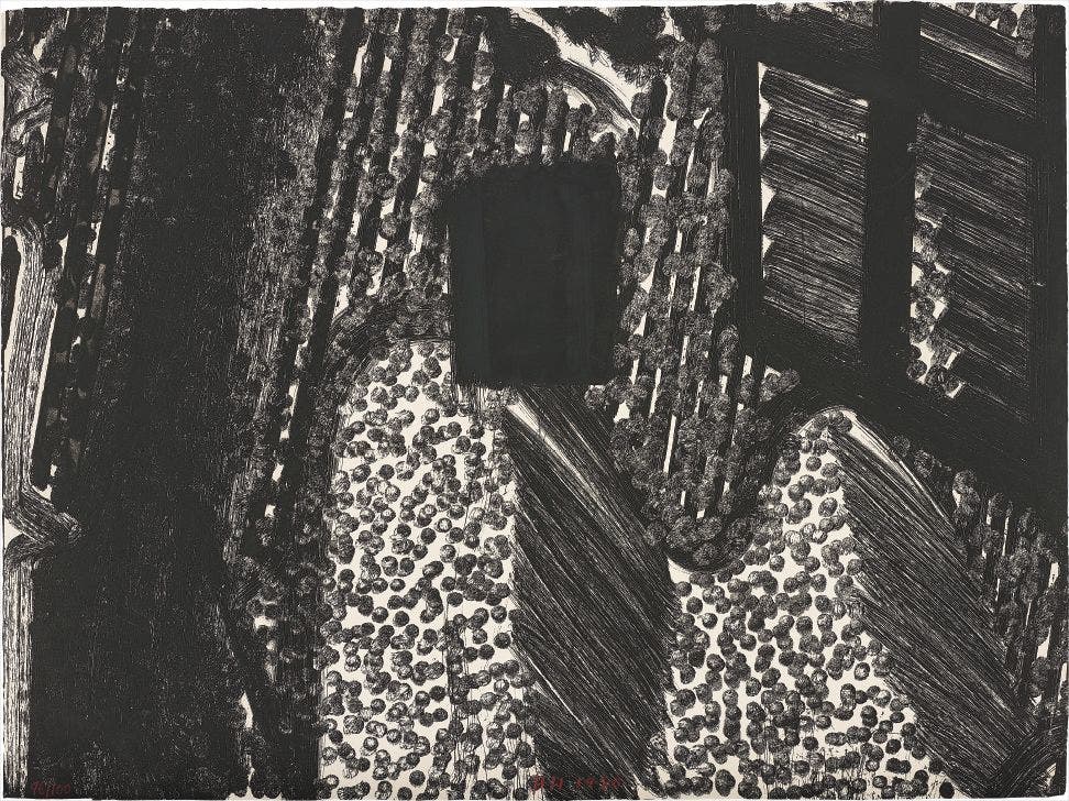 The seemingly casual, urgent quality of his paintings and prints belies a drawn-out process of making: it could take a year for Hodgkin to prepare to execute a single brushstroke. The resultant maximalist, saturated works on canvas, paper, wood and board can be intimately scaled and jewel-like, or oversized, opulent and theatrical. Whilst his early compositions have a collaged, geometric flatness, Hodgkin's later work (including etching and aquatint prints) increasingly incorporated more lush surface textures and complex, fluid patterns reminiscent of the Pahari miniatures from India, of which he was an avid collector.