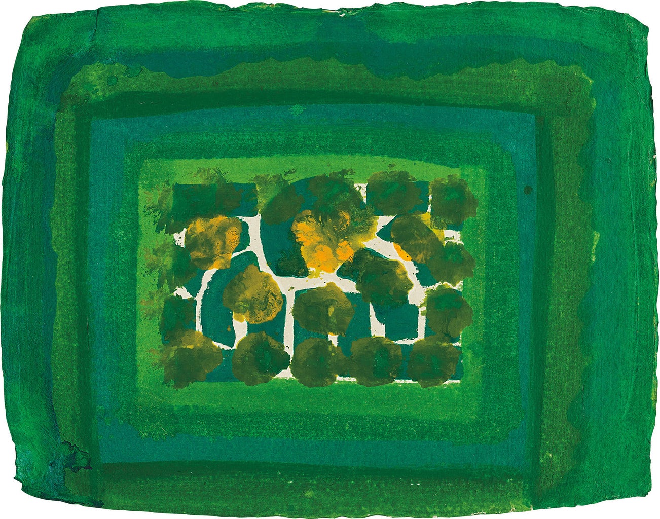 The seemingly casual, urgent quality of his paintings and prints belies a drawn-out process of making: it could take a year for Hodgkin to prepare to execute a single brushstroke. The resultant maximalist, saturated works on canvas, paper, wood and board can be intimately scaled and jewel-like, or oversized, opulent and theatrical. Whilst his early compositions have a collaged, geometric flatness, Hodgkin's later work (including etching and aquatint prints) increasingly incorporated more lush surface textures and complex, fluid patterns reminiscent of the Pahari miniatures from India, of which he was an avid collector.