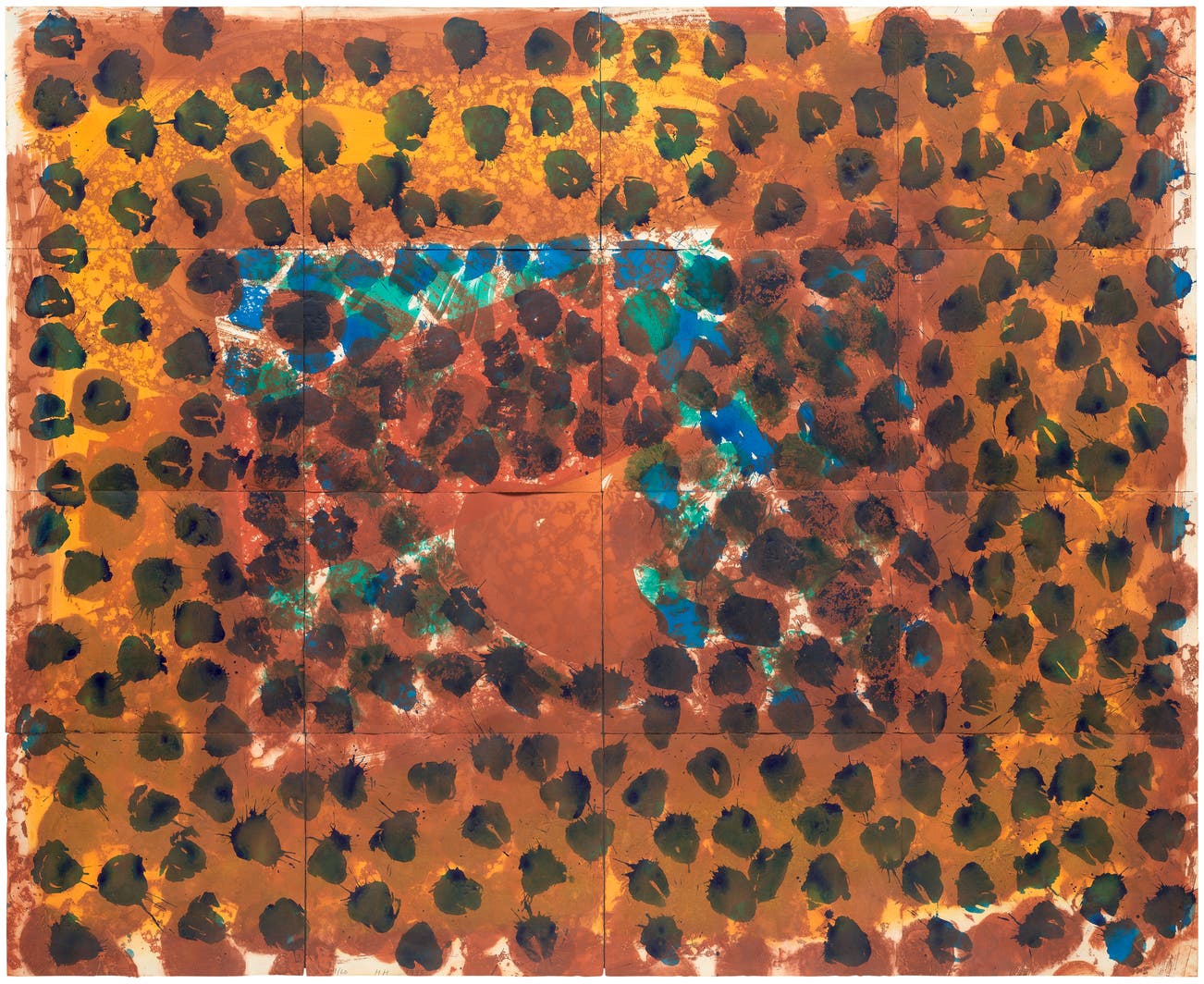 The seemingly casual, urgent quality of his paintings and prints belies a drawn-out process of making: it could take a year for Hodgkin to prepare to execute a single brushstroke. The resultant maximalist, saturated works on canvas, paper, wood and board can be intimately scaled and jewel-like, or oversized, opulent and theatrical. Whilst his early compositions have a collaged, geometric flatness, Hodgkin's later work (including etching and aquatint prints) increasingly incorporated more lush surface textures and complex, fluid patterns reminiscent of the Pahari miniatures from India, of which he was an avid collector.