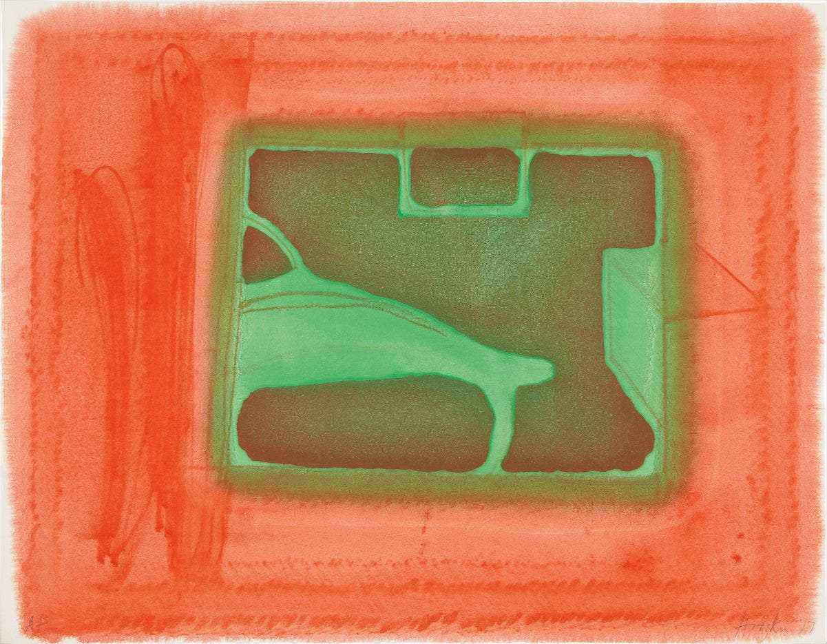 The seemingly casual, urgent quality of his paintings and prints belies a drawn-out process of making: it could take a year for Hodgkin to prepare to execute a single brushstroke. The resultant maximalist, saturated works on canvas, paper, wood and board can be intimately scaled and jewel-like, or oversized, opulent and theatrical. Whilst his early compositions have a collaged, geometric flatness, Hodgkin's later work (including etching and aquatint prints) increasingly incorporated more lush surface textures and complex, fluid patterns reminiscent of the Pahari miniatures from India, of which he was an avid collector.