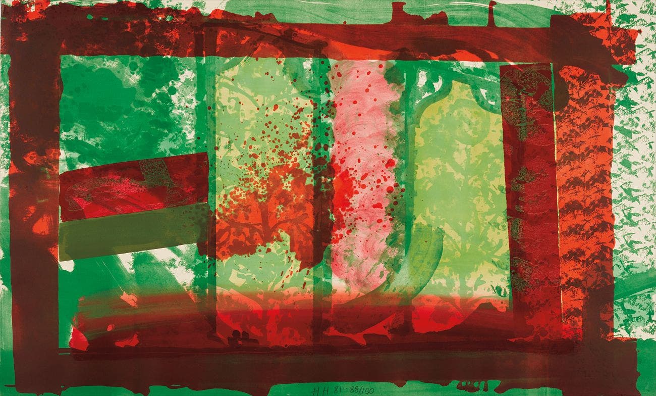 The seemingly casual, urgent quality of his paintings and prints belies a drawn-out process of making: it could take a year for Hodgkin to prepare to execute a single brushstroke. The resultant maximalist, saturated works on canvas, paper, wood and board can be intimately scaled and jewel-like, or oversized, opulent and theatrical. Whilst his early compositions have a collaged, geometric flatness, Hodgkin's later work (including etching and aquatint prints) increasingly incorporated more lush surface textures and complex, fluid patterns reminiscent of the Pahari miniatures from India, of which he was an avid collector.