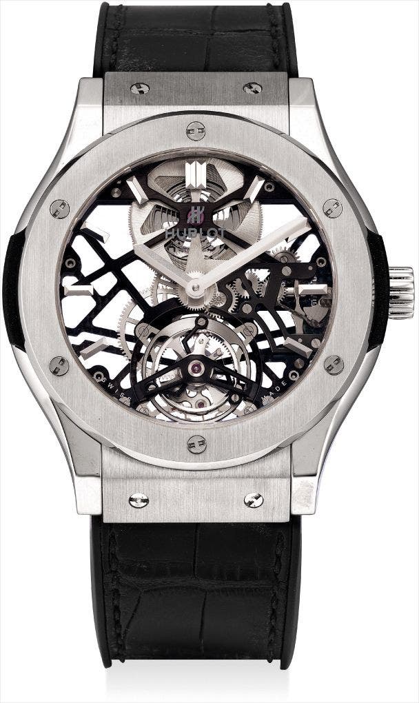 With a unique modern and architectural aesthetic, this masculine Classic Fusion limited edition wristwatch features a skeletonised dial that allows the wearer to admire the inner working of the mechanism. The present watch is cased in titanium, which perfectly matches the bridges and large mainspring at 12 o’clock. Complete with original certificate and fitted presentation box, the watch is in like new condition.