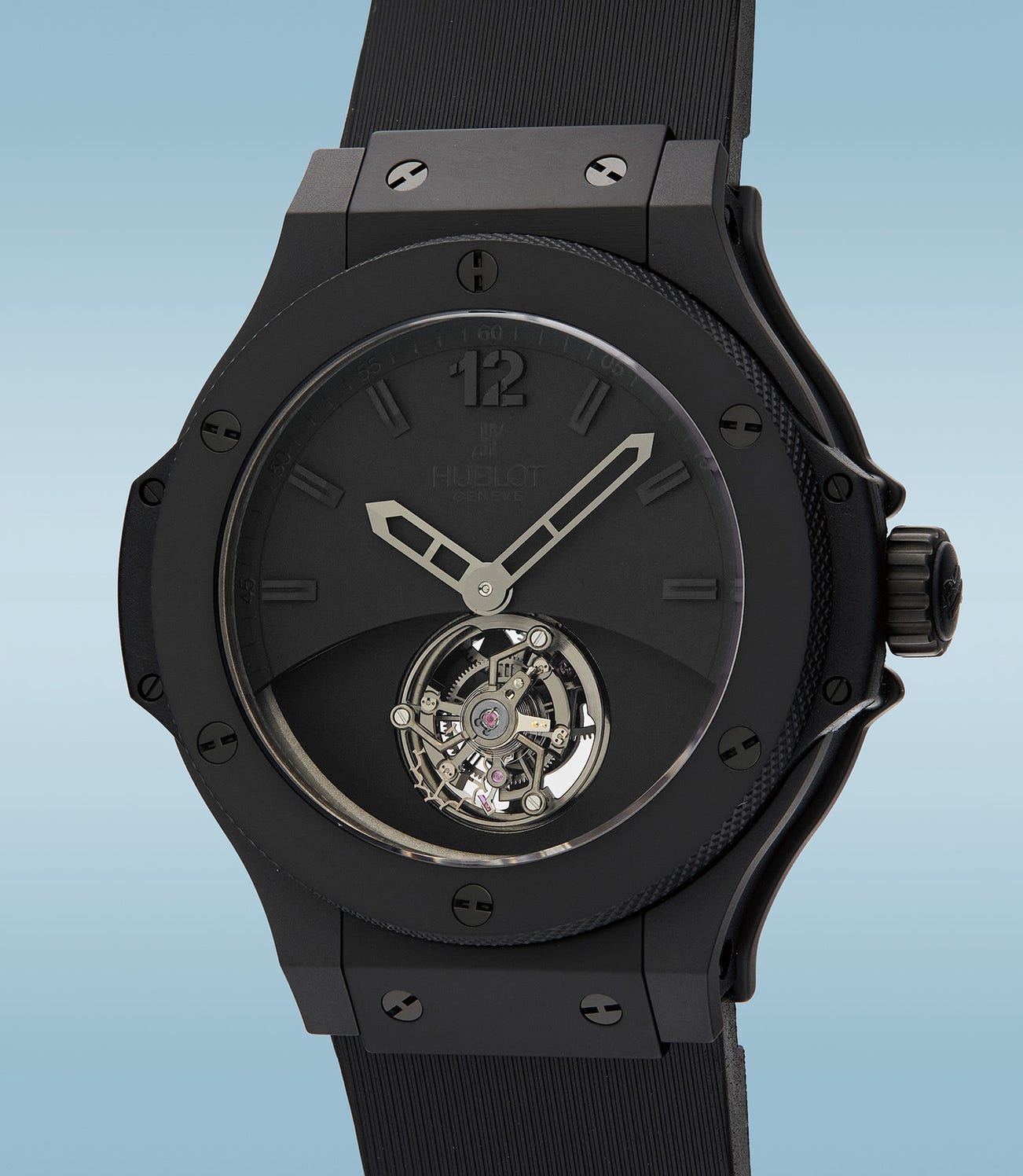 Ceramic has become a popular element in watchmaking known for its durability and hardness. The present Hublot Big Bang tourbillon wristwatch is encased in black ceramic and is a unique piece. The watch features a large, bold case crafted in black ceramic that is highly scratch-resistant. The black ceramic bezel is fitted with six blackened screws, giving the watch a very powerful and masculine appeal. It is most likely this all ceramic construction that makes the watch unique. Further enhancing the overall black appearance, the watch is fitted with a matte black dial and numerals, and a glazed aperture allowing the viewer to admire the one minute tourbillon carriage.