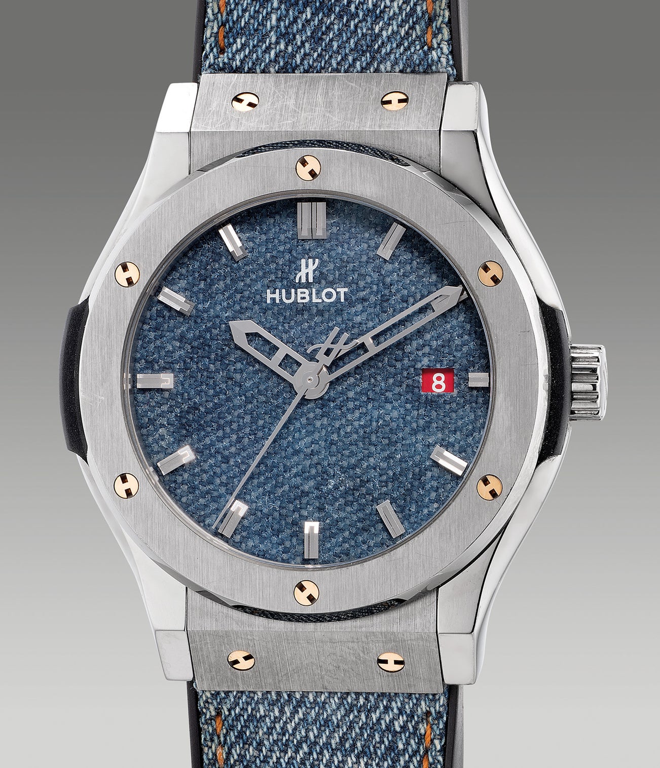 The Classic Fusion Jeans is a collaboration between Hublot and Laurent Picciotto, connoisseur and founder of Chronopassion. Inspired by the adventurous charisma of the cowboys from the Wild West, the Classic Fusion Jeans clashes the ruggedness of denim and the robustness of modern titanium. Boosting with originality and personality, the timepiece in 42mm diameter has a lean profile and is powered by the calibre SW300 with a power reserved of 42 hours. Fitted with a rubber strap, denim covering, and orange stitching as a finishing touch, the watch wears with extreme comfort on the wrist. The present example is no doubt the perfect choice for a casual weekend with a white shirt and a pair jeans.