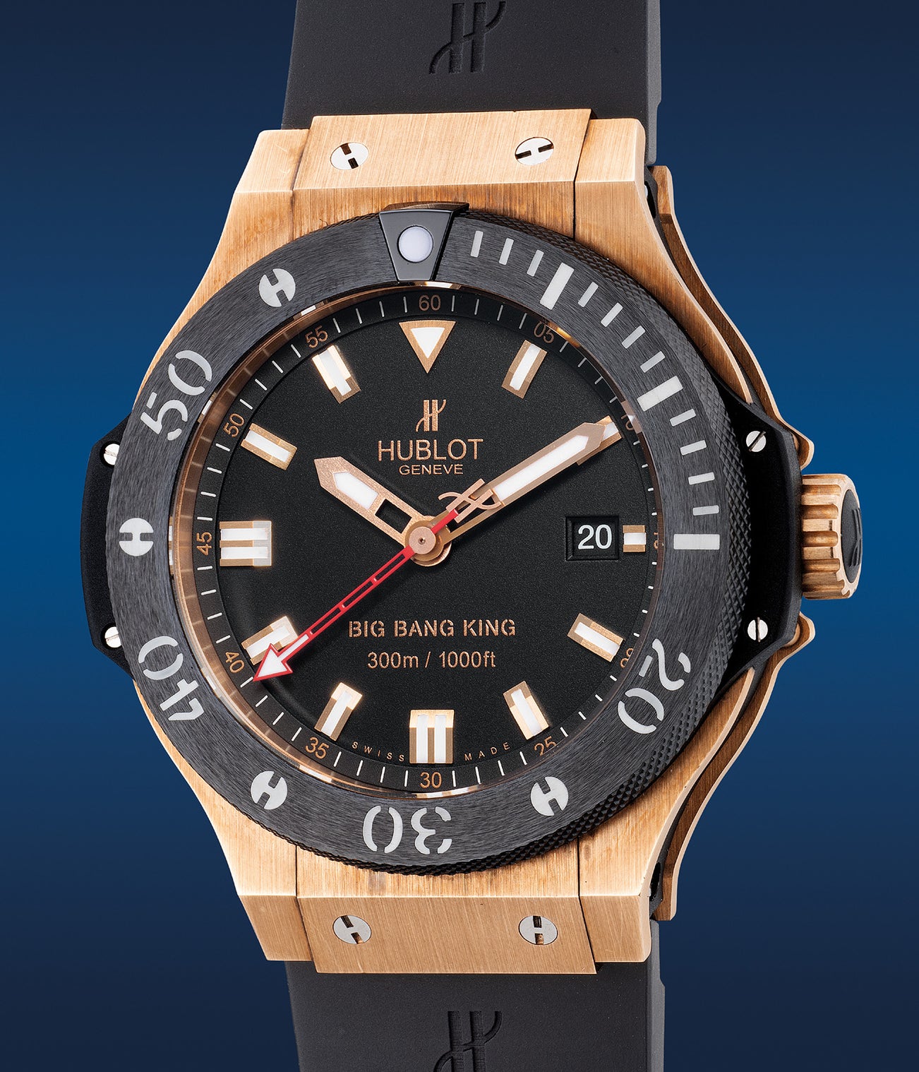 The present Hublot Big Bang King cased in a 44mm diameter pink gold case with a rotating bezel is made for the leisurely diver with a depth rating of 300 meters. Preserved in excellent overall condition and offered with no reserve, the present example is a great timepiece for the weekend at the beach.