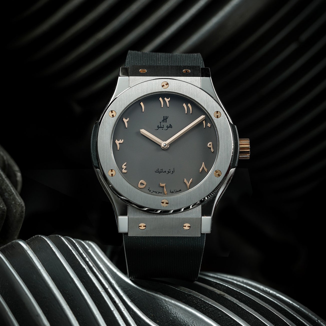 - The dial not only features elegant pink gold Eastern Arabic numerals, but also displays the brand name, "Automatic" and "Swiss Made" in Arabic.