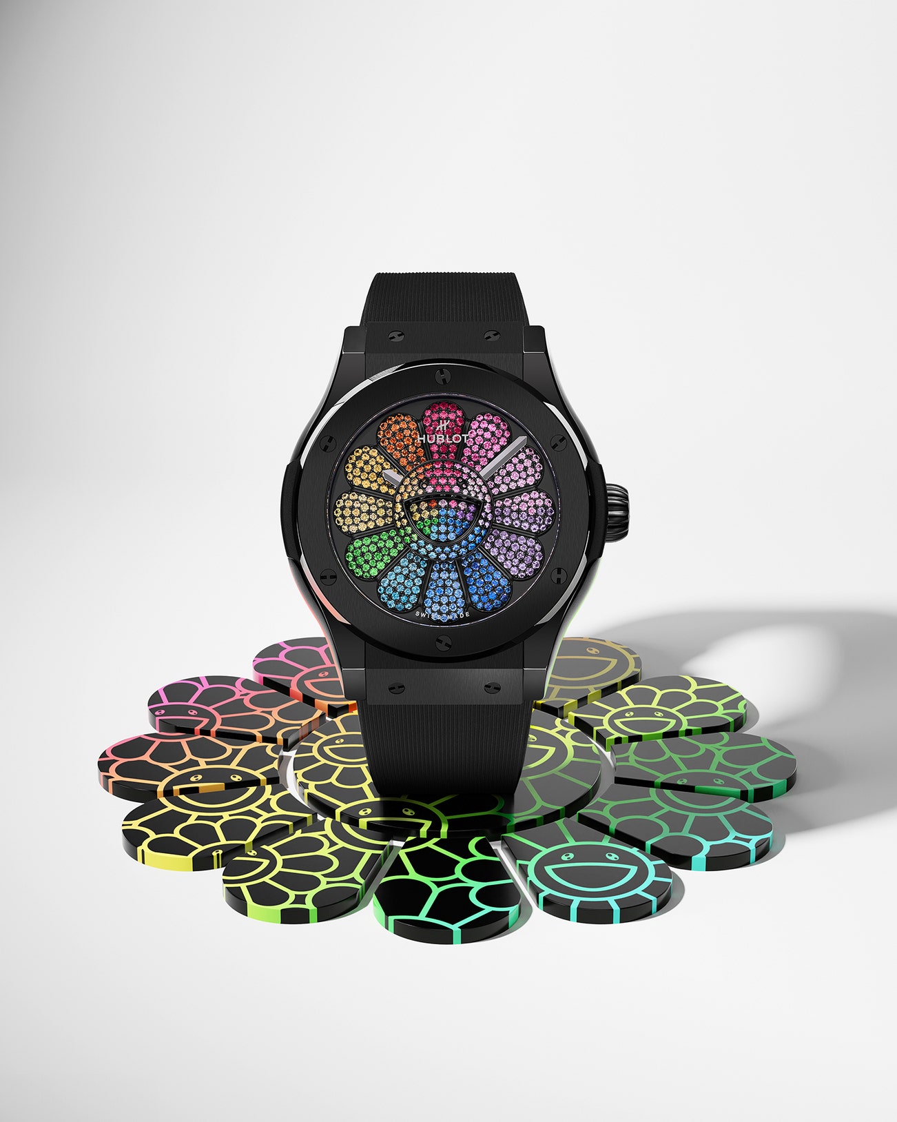 Originally presented to the public on February 24, 2023 at the Glass House in New York, the Classic Fusion Murakami Black Ceramic Rainbow was born from a collaboration featuring thirteen timepieces and NFTs unveiled to bridge the gap between watchmaking and digital art. At the time, Hublot had unveiled their new concept in collaboration with the celebrated artist Takashi Murakami: Together, they would present thirteen new NFTs and thirteen unique timepieces featuring the iconic smiling flower that is central to the Japanese artist’s work. The rule of the initiative would be as follows: twelve of these watches would be available for purchase only by an owner of an NFT of at least one of the brand’s previous collaborations with Murakami (the 324 available All Black or Sapphire Rainbow). Each of the twelve new Classic Fusion Murakami watches also comes with an accompanying NFT. On top of this, should a collector manage to acquire all twelve of those NFTs (through trading), they would be eligible to purchase the thirteenth piece unique watch: the Classic Fusion Takashi Murakami Black Ceramic Rainbow. Collectors would be given a period of one year during which they would have the opportunity to trade the twelve NFTs on the OpenSea platform. However, if no one would be able to collect all twelve NFTs, Hublot would auction off the thirteenth Classic Fusion Takashi Murakami Black Ceramic Rainbow (with the proceeds going to charity). After a year, no collector has been able to acquire all twelve NFTs, and Hublot has now entrusted Phillips in Association with Bacs & Russo with the public sale of the Classic Fusion Murakami Black Ceramic Rainbow.
