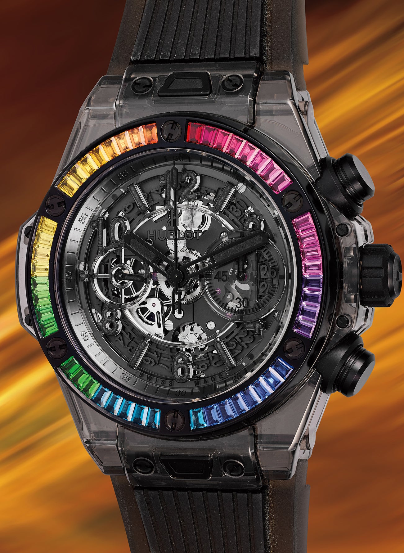 A 2018 limited edition of only 50 pieces, the Big Bang Unico Sapphire Rainbow was introduced with 50 pieces in the smoked/black sapphire and 50 pieces in the clear sapphire – both fitted with a gem-set rainbow bezel. Though drawing pointed comparisons – and likely some inspiration – from a certain other stately brand, the stone matching and contrast against the smoky case is without a doubt both striking and tastefully executed. The multi-gem array, including sapphire, tsavorite, amethyst, topaz, and ruby, is beautifully matched in both color gradient, quality, and transparency. Even at 45mm, the watch is surprisingly light, and of course with a hardness only next to diamonds, the sapphire case is nearly scratch-proof.