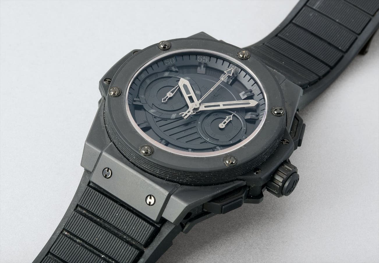 This watch is unique! A variety of matte tones combine from the dial to the strap, and all the eye can see is…black! This King Power Foudroyante All Black was made especially for Jean Claude Biver by Hublot employees and presented to him on 20 September 2009 for his 60th birthday. Mr Biver then generously donated the watch to a charity auction where the hammer price was a multiple of the retail price of the standard model.