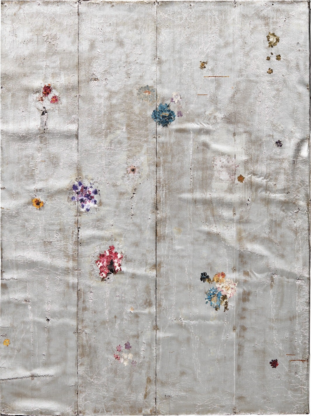 aluminum foil, aluminum coating and oil on tar, mounted to wood