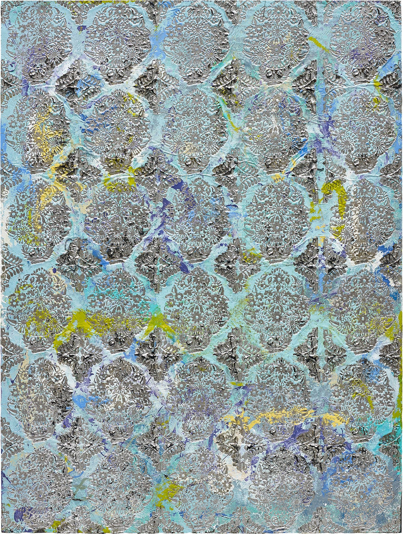 aluminium foil, aluminium coating and oil on tar mounted on panel