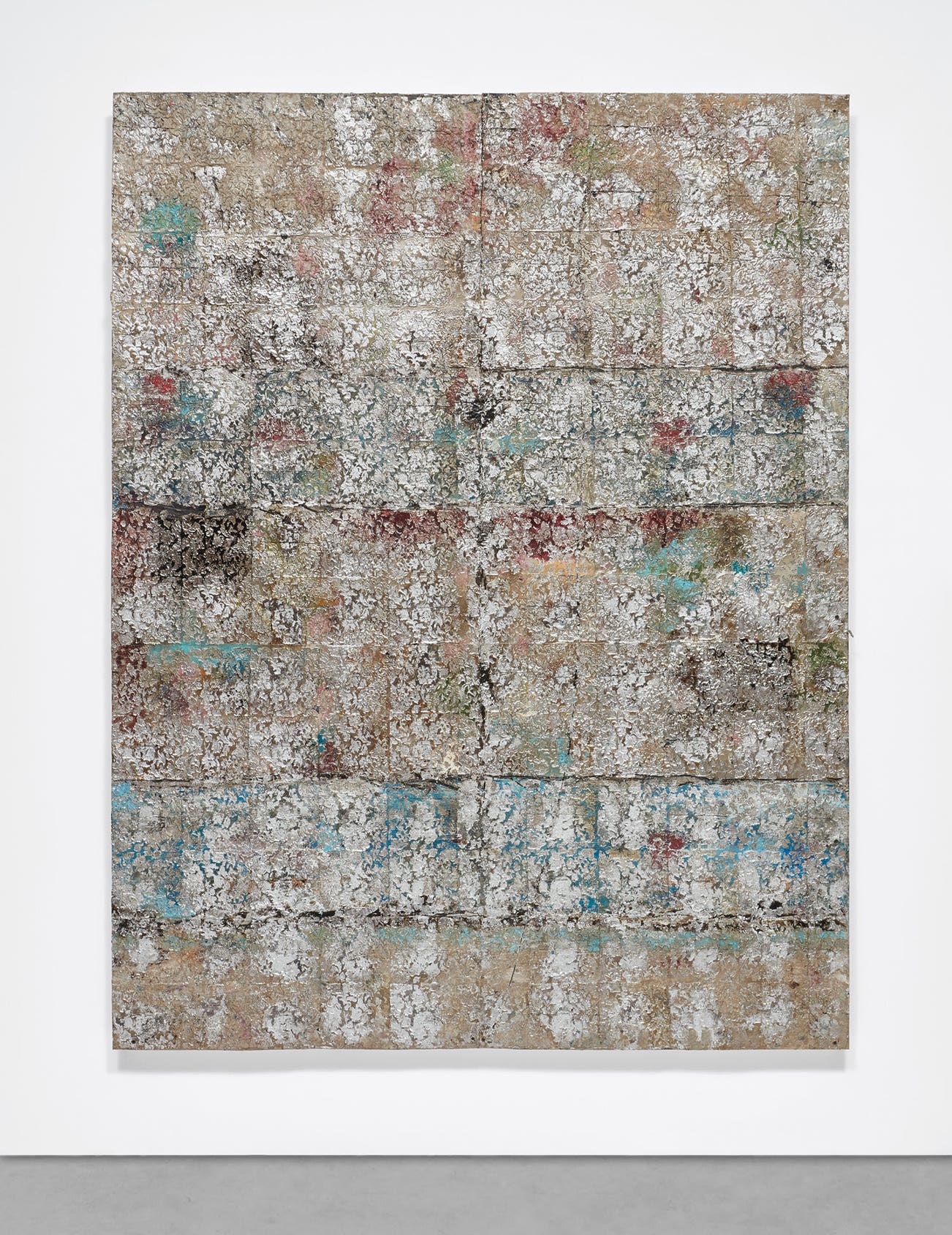 aluminum foil, aluminum coating and oil on tar mounted to panel