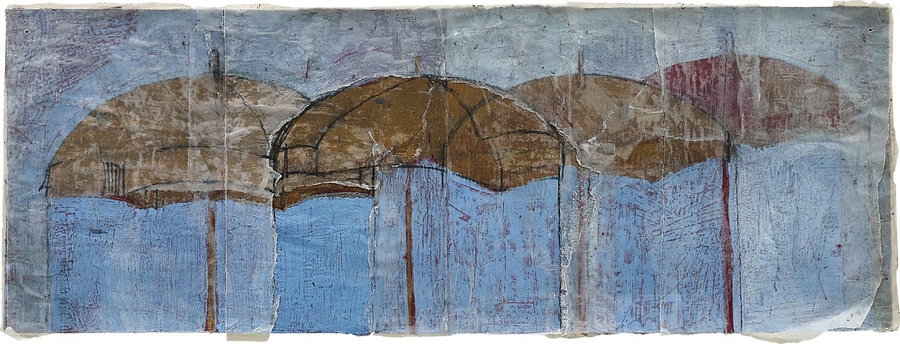 pencil, oil, metallic paint, glassine and newspaper collage on paper