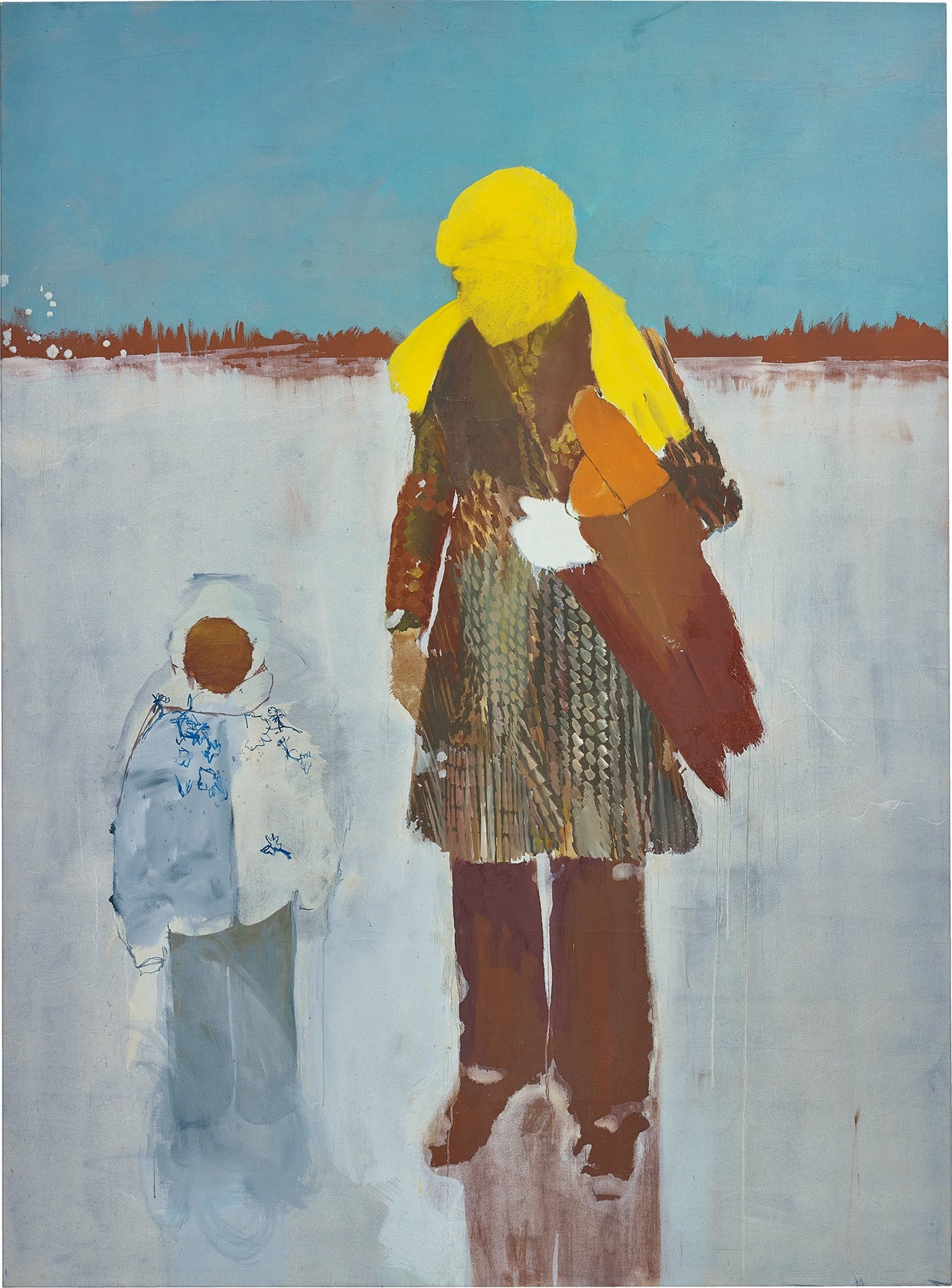 An arresting early work painted at the dawn of Hurvin Anderson’s career, Beaver Lake, 1998, presents an image that spans photographic imagery, painterly portraiture and sheer imagination, meandering between figuration and abstraction. In the composition, two shrouded figures – an adult and a child – are wrapped in winter attire as they traverse a frozen lake. Showing their backs to a reddish landscape, the figures are haloed from above by a blue-green sky that radiates shafts of colour below their feet. Exemplary of Anderson’s unique pictorial practice, the painting was created alongside a sister work entitled Mount Royal (Lac des Castors), 1998, and featured in the artist’s graduate show at the Royal College of Art, London. Culled from a clear photographic foundation, both works offer loose pictorial interpretations of the eponymous Albertan Lake that Anderson’s sister visited when she emigrated to Canada from the United Kingdom. Though it references a specific moment and place – picturing her and her young child braving the landscape’s icy grounds – Beaver Lake transcends its source document and exemplifies a kind of muted vibrancy that has since become synonymous with Anderson’s unique visual language. Celebrated most prominently on the occasion of his Turner Prize nomination in 2017, the artist’s body of work was moreover given a potent spotlight during his major solo exhibition at Ikon Gallery, Birmingham, in 2013, which included the present work.