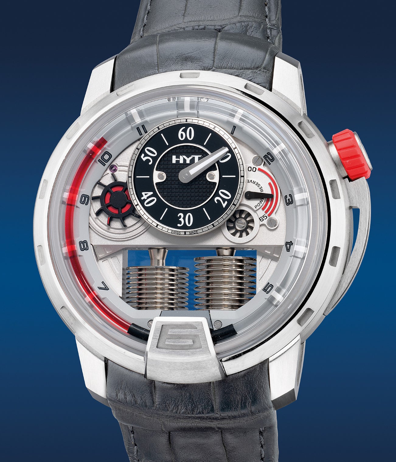 Regarded as one of the youngest independent manufacturers in the field of watchmaking, HYT was officially launched in 2012. Introduced in the same year, the H1 was the first wristwatch released by the firm at Baselworld and immediately making a statement through its ground-breaking innovative approach to tell time.