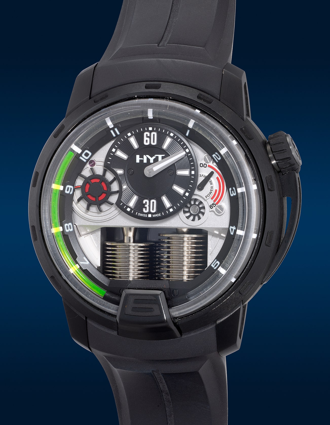 - The H1 combines traditional art-mechanics with the revolutionary technology of a retrograde fluid hour display. A fine minutes dial sits in the middle on the top sector of the semi-skeletonized dial, with a delightful mobile small seconds wheel on the left and power reserve indication on the right, while the bottom of the dial is reserved for two reservoirs, responsible for compression and expansion. This mechanism drives the fluorescent green liquid through a curved borosilicate glass tube, indicating the hour. The fluid is also available in other colours, but the fluorescent green has remained a classic.