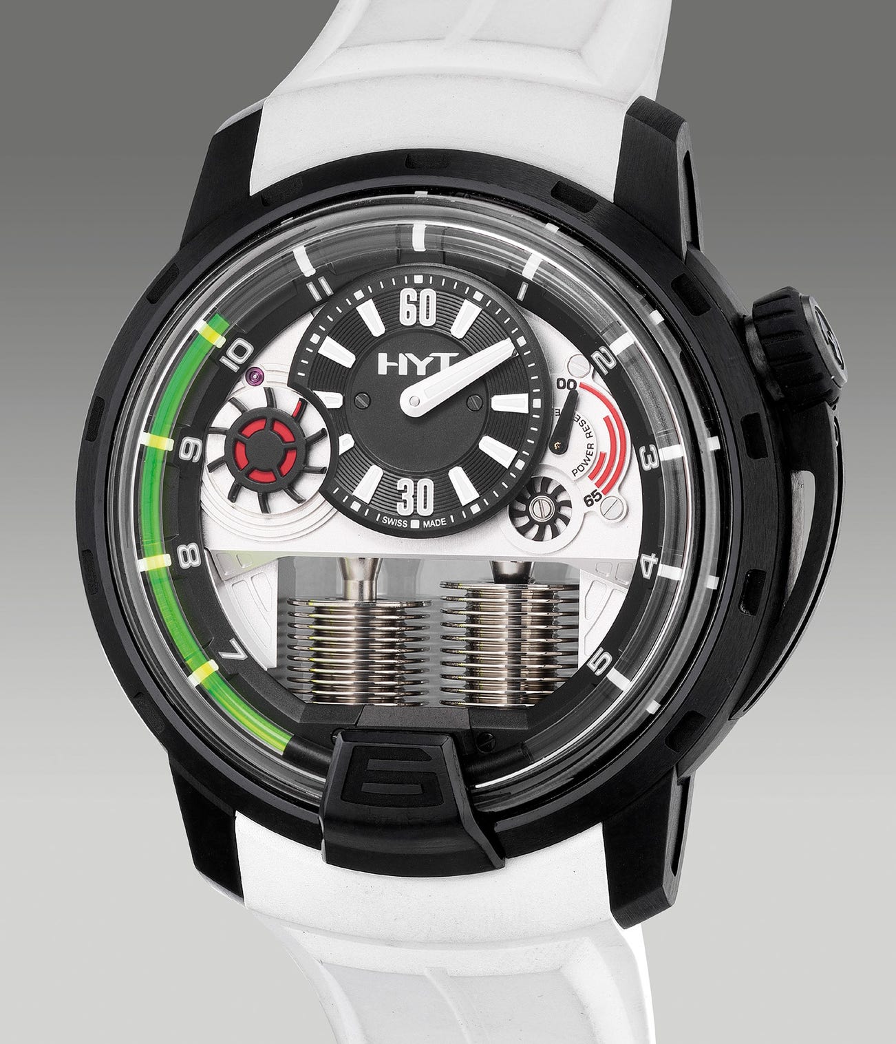 Regarded as one of the youngest independent manufacturers in the field of watchmaking, HYT was officially launched in 2012. Introduced in the same year, the H1 was the first wristwatch released by the firm at Baselworld and immediately making a statement through its groundbreaking innovative approach to tell time.