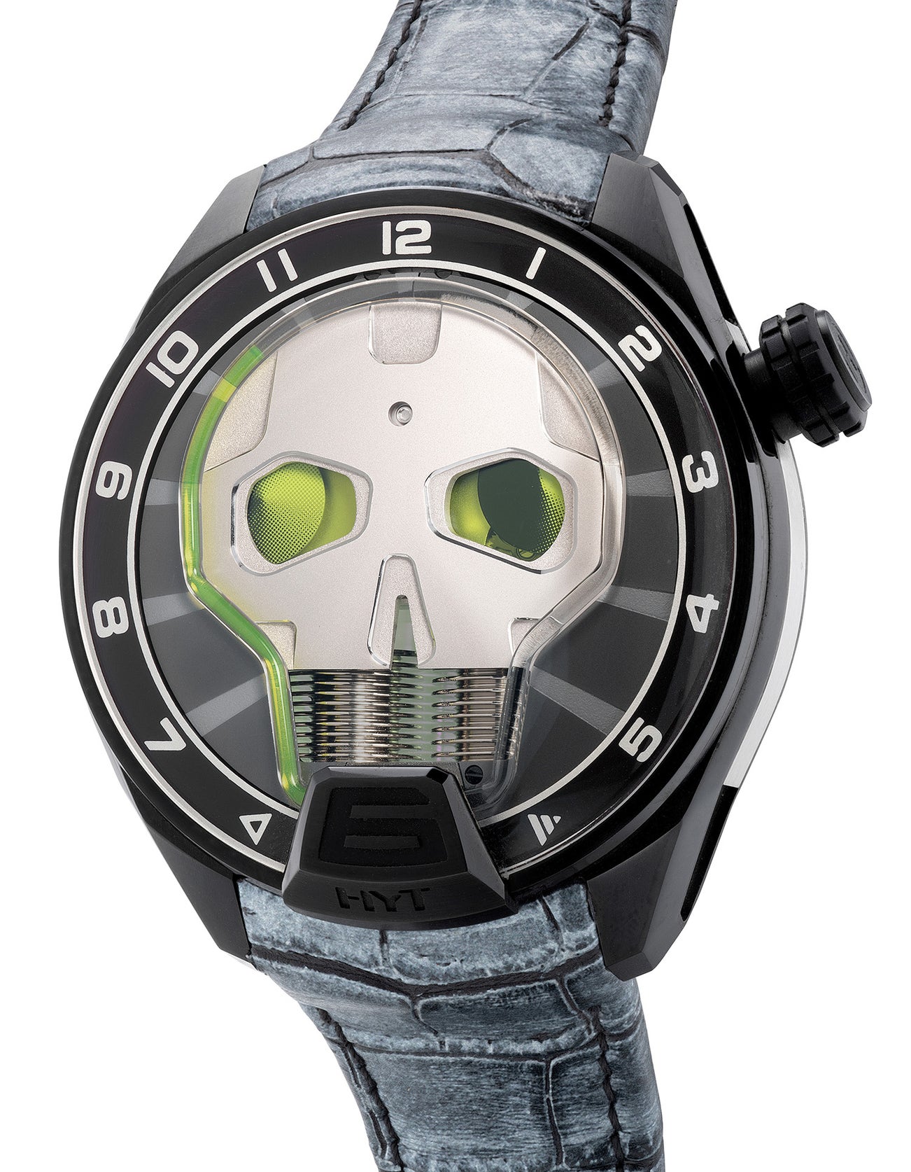 The Skull by HYT is probably not the most practical wristwatch manufactured in recent times but certainly one that is far more interesting than your usual timepiece. Established in 2012, HYT is one of the youngest independent firms to appear on the scene. With that said, the brand has catapulted themselves to the spotlight of the competitive scene of independents by stunning the community with their innovative approach to tell time through an unusual retrograde-style fluid hours. With astounding success, HYT launched their very first timepiece in the same year of the firm’s establishment, the H1 and was awarded the Innovation Watch Prize at the 2012 GPHG.