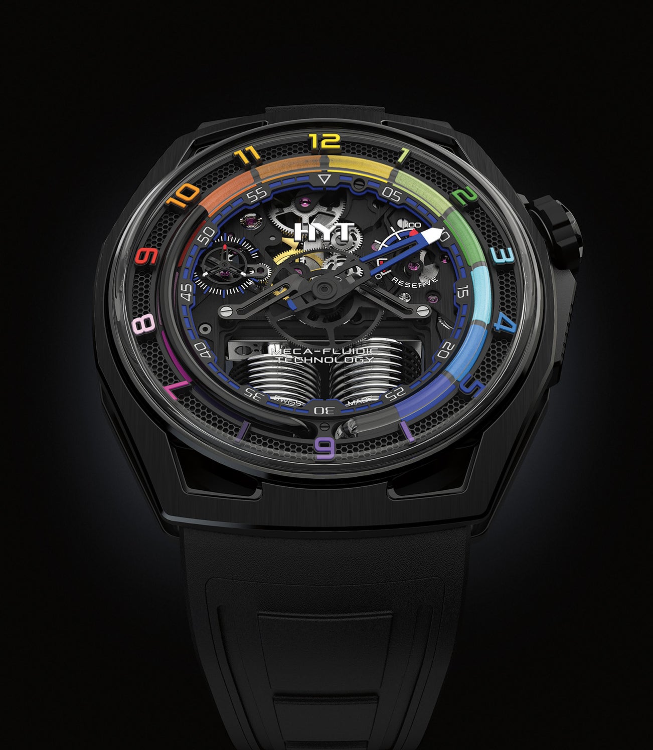 The design inspiration for this one-of-a-kind HYT timepiece are the rainbow colors that often shine on far away nebulas in the cosmos. The colors glow in the deep black of space, and the overall effect is mesmerizing. To achieve this spectacular effect, all elements of the case, strap, and a portion of the dial are kept black, to draw further attention to the rainbow colors.