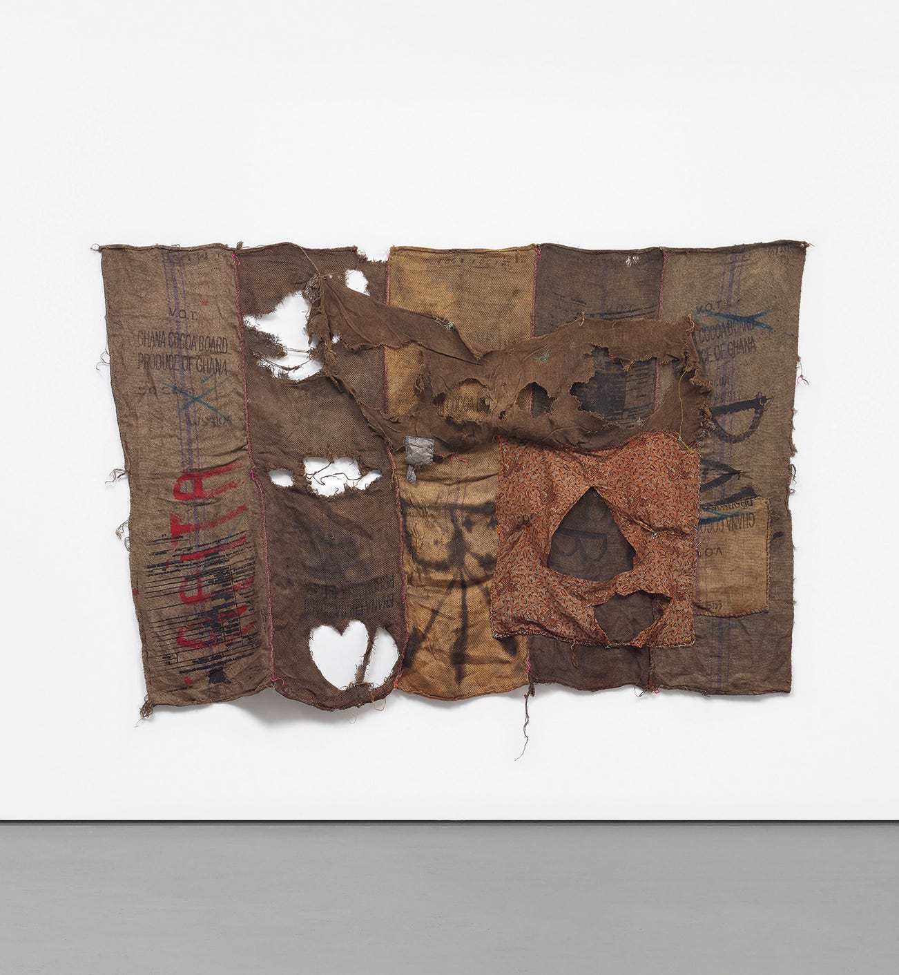 ‘They are jute sacks used for the transportation of food and commodities in Ghana, specifically cocoa. They are produced in Southeast Asia with an intense amount of labour. I was first of all drawn to this material in terms of “the common”: In Ghana almost every home has it. It has a lot of uses. When you take a bus on a rainy day and you need to clean the mud off your feet there is a jute sack there to do that work. If there is a fire you can quench it with a wet jute sack.' – Ibrahim Mahama