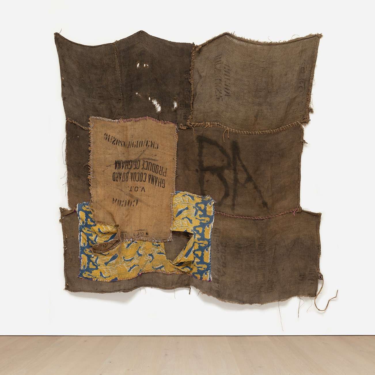 acrylic and wax print cloth on charcoal jute sacks