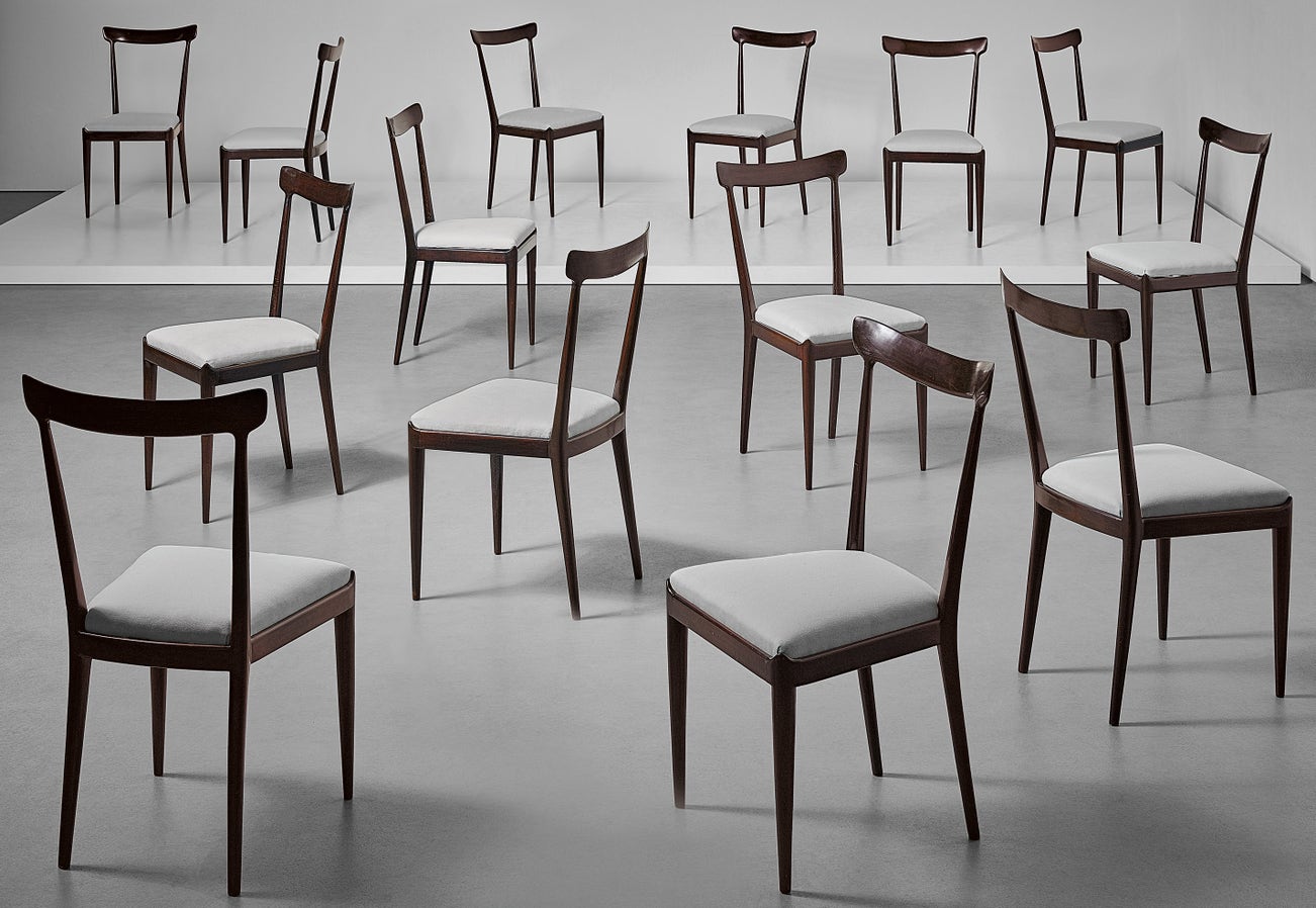 The present model dining chair was exhibited at 'Lo stile nell’arredamento moderno', Fede Cheti Atelier, Milan, December 1947-January 1948 and the XXVI Milan Fair, 1948.