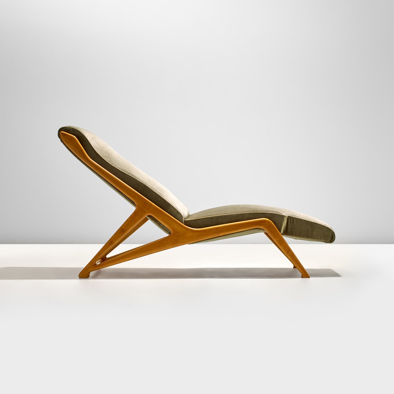 The present lot is a reinterpretation of the bedroom dormeuse, a type of reclining armchair for one person to rest which came back into fashion in high-end interiors of the 1930s and 1940s, gaining its own distinct typological identity. Indebted to the skill of the trusted Cantù artisans, Parisi reinterpreted its typically heavy form (an armchair that extends into the seat and sometimes slightly reclines the backrest), lightening it and giving it a new, modern look. Although its purpose is functional in nature, containing the upholstered section, the wooden structure seems to have a life of its own. Indeed, it appears as a three-dimensional ensemble of stylised, plant-like elements that recall the compositional motifs of the small, but exquisite pieces of furniture Parisi designed for Fede Cheti's exhibitions in 1947. The present rare chaise longue embodies construction techniques that, on the one hand, ensure stability, and on the other, allow for freedom of form, with delicately irregular and organic lines that bring the furniture closer to unusual sculptural solutions.