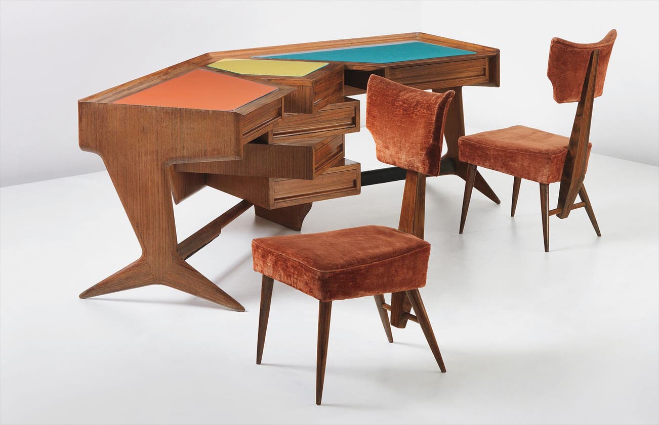 Desk: walnut, paper, glass, rubber; chairs: fabric, walnut.
