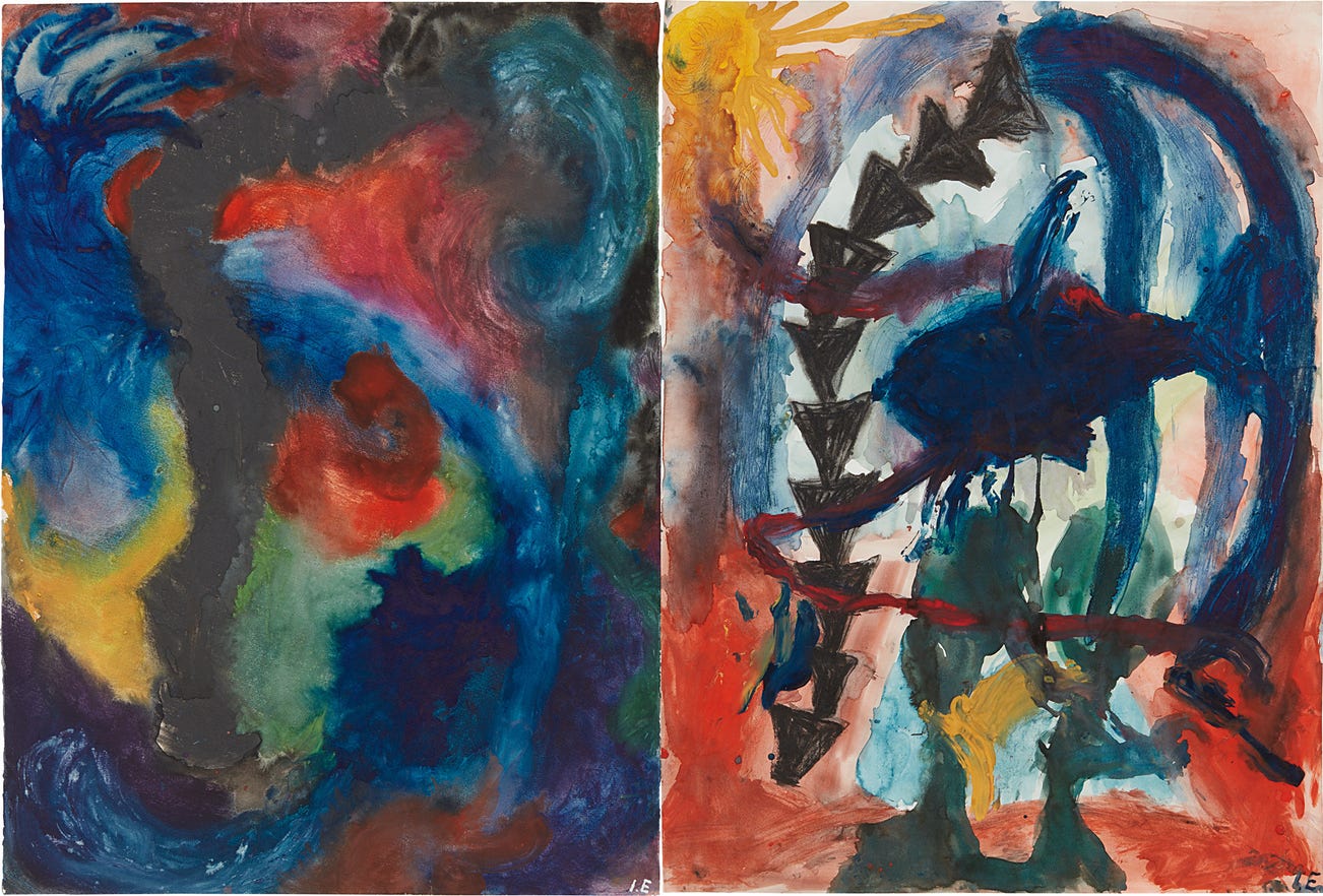 signed with the artist's initials "I.E" lower right of left sheet; further signed with the artist's initials "I.E" lower right of right sheet