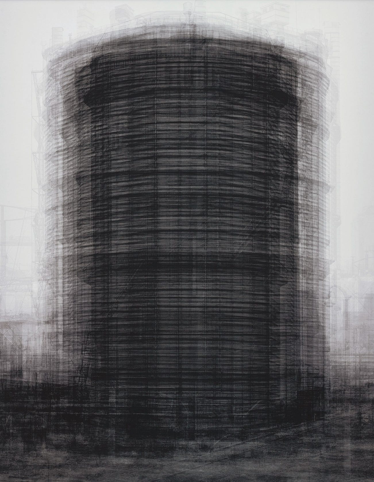 every…Bernd and Hilla Becher Prison Type Gasholder, 2004, the work offered here, is an exceptional example of Idris Khan’s digitally layered composite photographs of known cultural subjects for which he first gained wide acclaim. Drawing inspiration from master photographers Bernd and Hilla Becher and their pursuit to create typologies of industrial-era structures, such as water towers and gas holders, Khan reimagines their series through a seemingly contrasting process of superimposing and condensing, resulting in entirely new works. The present image was created by scanning every Becher photograph of a prison type gasholder taken over 30 years across Europe and the United States and then digitally layering them. Khan explains that ‘this time-consuming procedure is an integral part of the work, not least because it reminds [him] of the time it took to produce the original.’ His technique of layering the digital scans produces an intensity of tone at the centre of the image while allowing the subtle details of individual structures to radiate towards the outer edges. Resembling a drawing, the resulting large-scale work with its ghostly outlines is haunting, reminding us of the passage of time as these industrial relics continue to disappear.