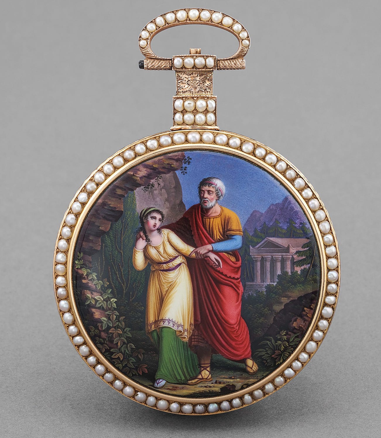 The Greek myth of Oedipus inspired many artists from the antiquity till today. In the early 19th century, enamel miniature painters found inspiration in many classical subject ranging from copies of famous paintings to Greek mythology as in this pocket watch. The scene on this watch depicts the old and blind Oedipus wandering around Thebes with his daughter Antigone and could be seen as a symbol of filial piety or dutiful loyalty.
