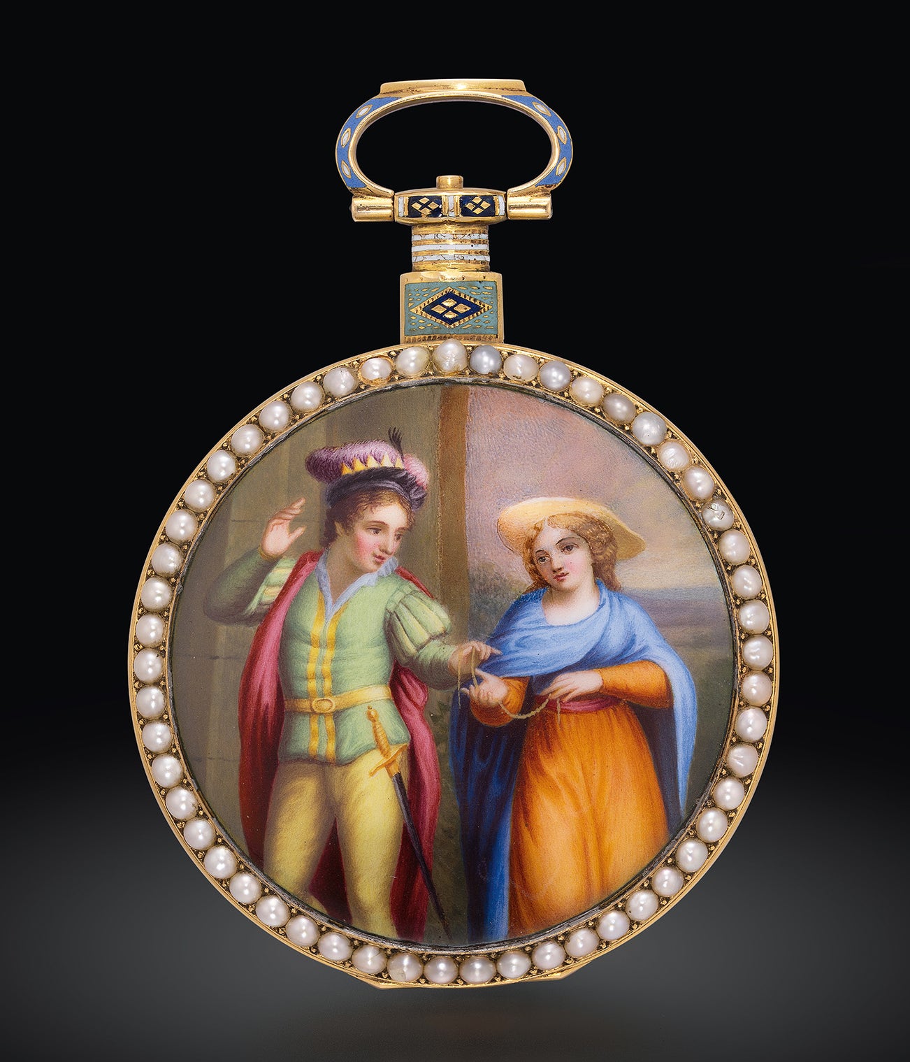 The present 60mm diameter Empire-styled gem from circa 1820 previously part of the Samuel N. Tonkin collection has been kept in private hands for 28 years. A charming example, the reverse is finely decorated with a polychrome enamelled scene of a courtier and courtesan in soft pastel palette with detailed drapery works on their outfit. The scene depicted in the neo-rocaille, neo-Louis XV style, which was very in vogue in the 19th century, demonstrates the taste of the Chinese market for this type of motif. Framed with elegant split pearls, the caseband and pendant are flourished with lozenges and florets turquoise, blue and red enamel that gives the timepiece an imperial appeal. Powered by the “Chinese Caliber”, a gilt duplex movement with beautiful foliage, scrolls and paterae engravings, it also features a five-arm polished steel balance wheel with a diamond endstone on the bridge. A once in a blue moon opportunity to acquire a museum worthy timepiece for over 200 years old to your private collection, this is a trophy that is not only beautiful for its look, but also a part of horological history where the East meets West.