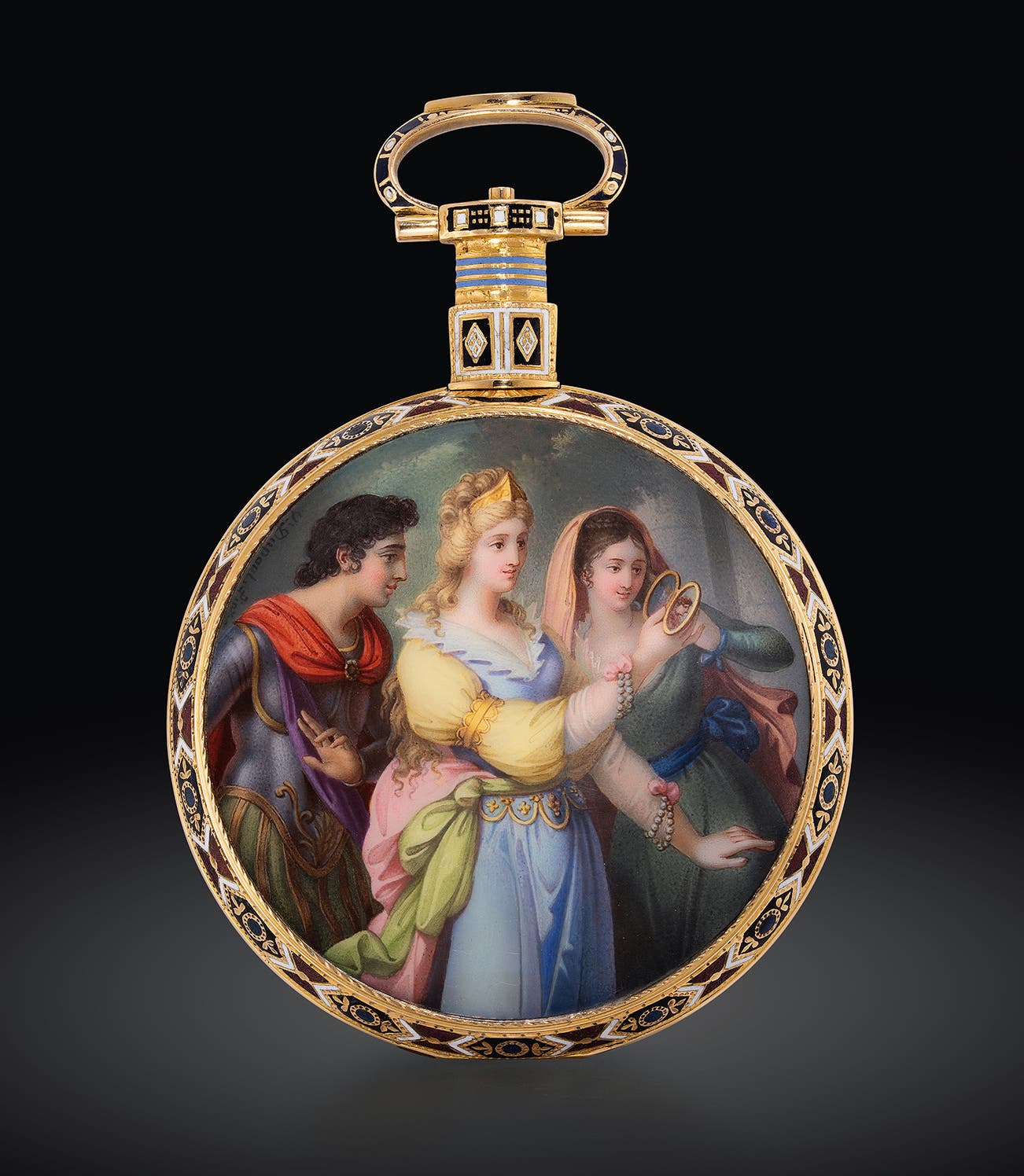 This exquisite pocket watch features a spring-loaded back cover intricately painted with a captivating scene of King Arthur and Emmeline. In this artwork by Jean-François-Victor Dupont, Emmeline holds a mirror belonging to her attendant Matilda, reflecting King Arthur's image, inspired by a 1787 engraving by P.W. Tomkins after Charles Ansell. The bezels are adorned with striking red, white, and blue champlevé enamel in a geometric pattern, enhancing its visual appeal.