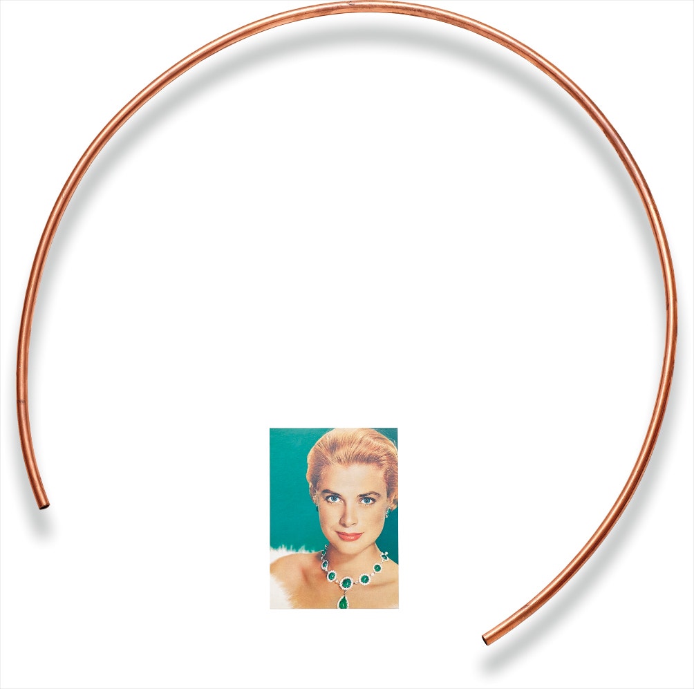 Wall-hanging multiple comprised of bent copper pipe and three loose offset printed postcards in colours (one for installation, one spare and one as a Certificate of Authenticity), contained in the original cardboard box with exemplar postcard adhered to the inside.
