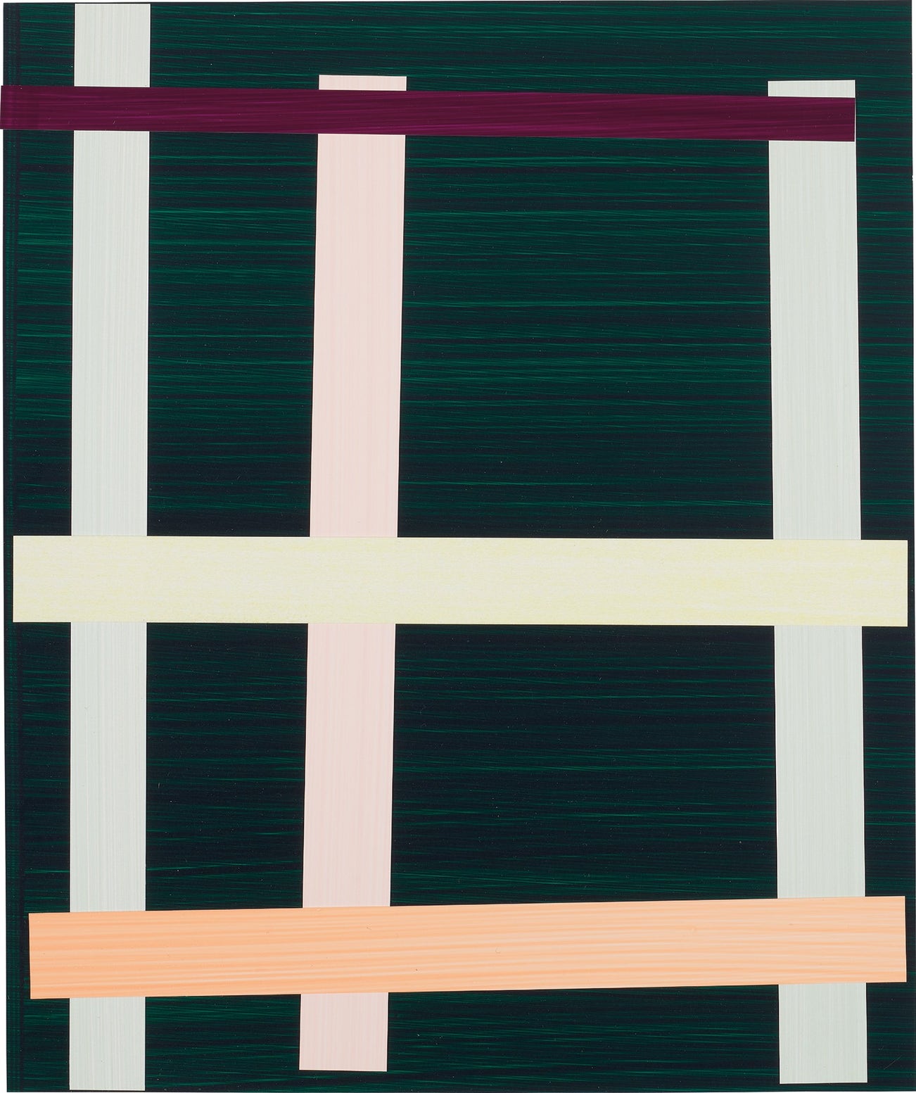 Acrylic in colours, on seven constructed and collaged plastic panels, mounted to aluminium (as issued).