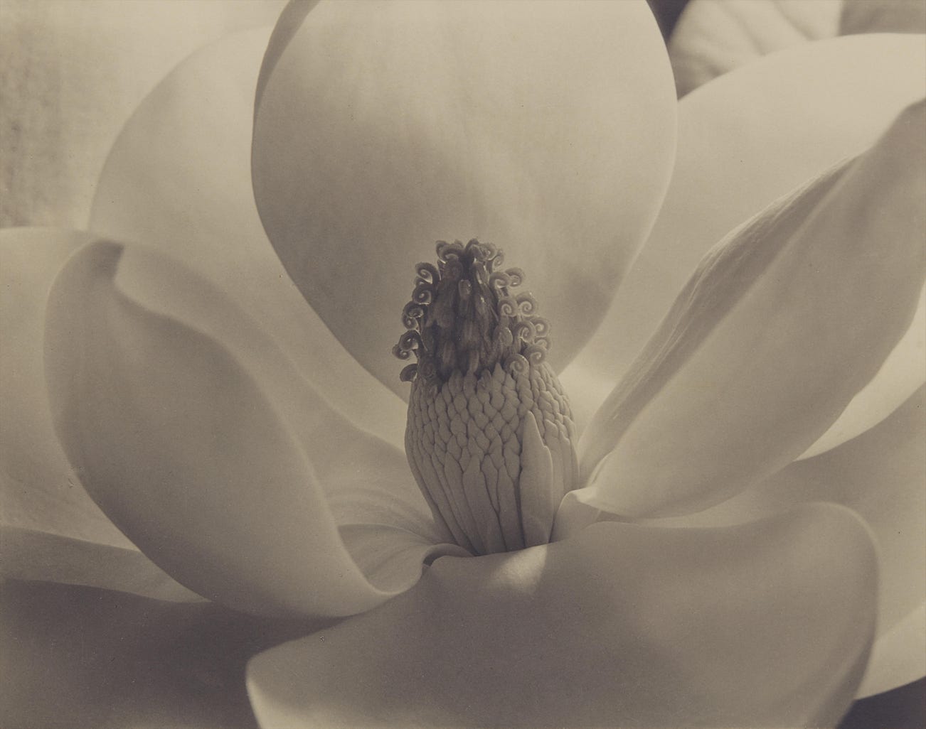 Magnolia Blossom is one of series of photographs of flowers and plants Cunningham made in the 1920s that, in their own quiet way, were revolutionary in approach and execution. In Magnolia Blossom, the flower fills the entire frame. The pistils and stamens are in sharp focus and, through Cunningham’s masterful handling, the petals become a transfixing study of light, shadow, and translucence. It is an unsentimental and, for its time, entirely new approach to familiar and easily-romanticized subject matter.