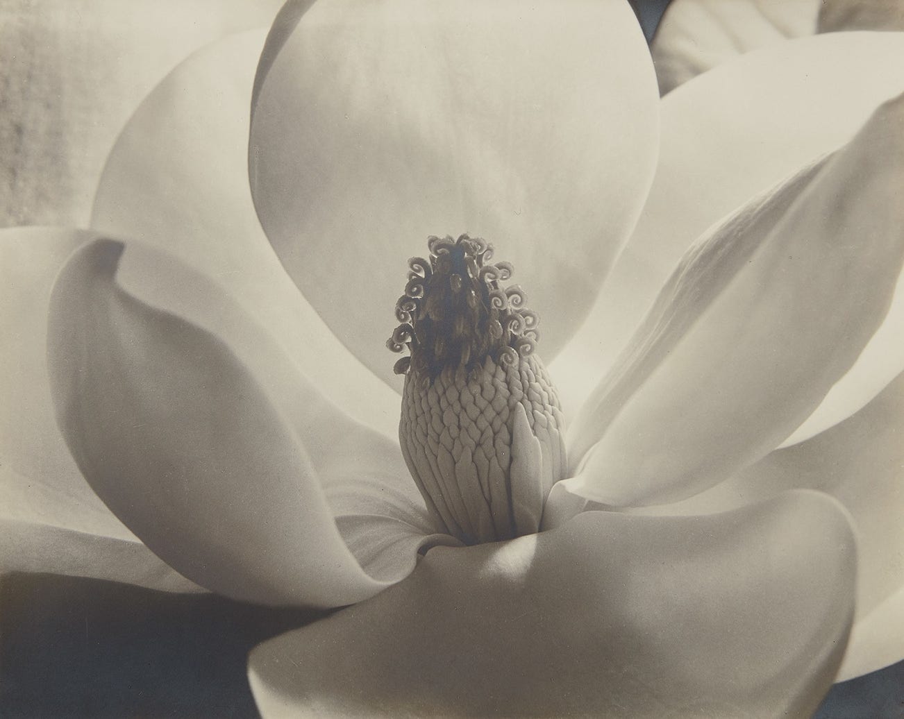 Magnolia Blossom has become the signature image from the series of flower studies Imogen Cunningham created in the 1920s. Along with Calla (lot 36), Magnolia Blossom was one of eight botanical studies by Cunningham shown in the pivotal 1929 Film und Foto exhibition in Stuttgart. Fluent in German, Cunningham had studied photography and photo-chemistry in Germany in the 1910s, and the title she gave to Magnolia Blossom for Film und Foto was ‘Formen Einer Blume.’ It was exhibited under the German title in several other European venues thereafter, and it is this title which appears on her Harbor View studio label accompanying this lot. It is possible that the print offered here was an early exhibition print.