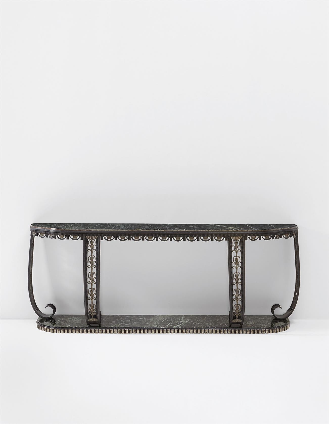 Vert antique marble, wrought iron, silver-plated brass.