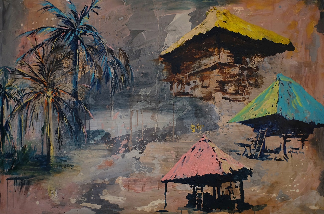Natural High explores the significance of elevation, both literal and figurative, in the Philippines. Topographically characterised by vast mountainous forms enshrouded by jungle, the Philippines is a country in which families have often inhabited homes raised high off the ground. A tradition passed down from ancestors, elevated living was seen as a tactical move to gain a vantage point as well as to place the family unit closer to the Gods and allow for closer communication with the heavens. Indy Paredes evokes these architectural structures in pop versions of red, blue and yellow, the colours of the Filipino flag, which reflect the recent cultural shift from the organic to the synthetic that occurred in the Philippines due to colonialisation and modernisation.