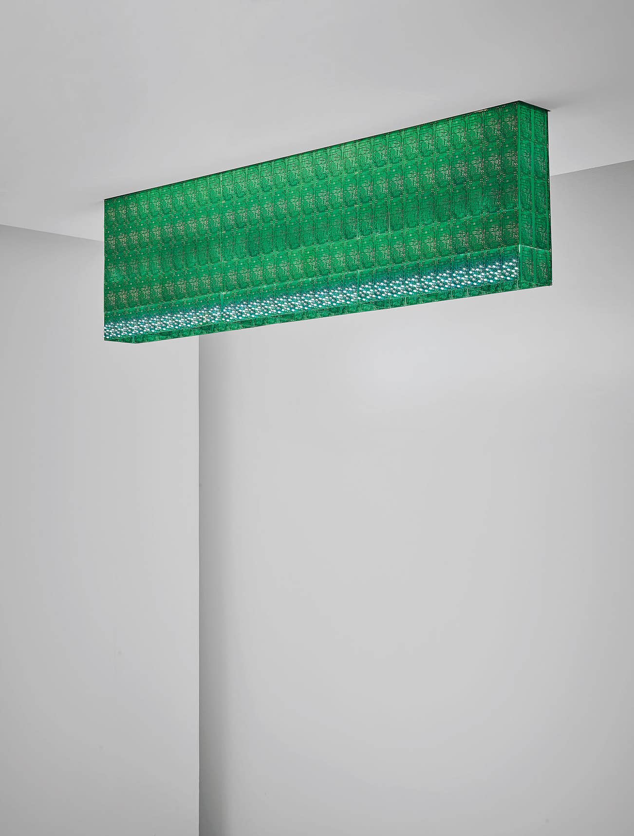The present ceiling light designed by the lighting designer Ingo Maurer was commissioned in late 1997. Working at the forefront of lighting design, Maurer had begun working with LED technology earlier that year, before which LEDs had not been used for interior lighting. Constructed from printed circuit boards, the ceiling light features a free arrangement of LEDs along the lower edges, which the designer programmed to include four settings: the white lights alone, the addition of either the red or blue lights, or all of the red, blue and white lights. Maurer, who had initially intended for the light to include only the last formation, surprised his clients with the addition of the individual colour options upon its installation in late 1998. Maurer’s innovative design demonstrates his interest in the light bulb (or light source) as a design object independent of the light fixture and is a playful reduction of the fixture's form to its essential function.