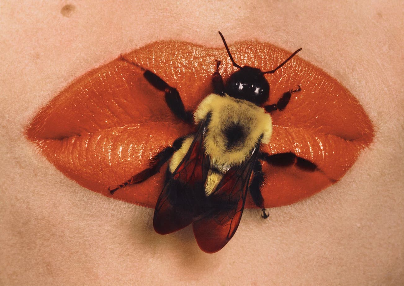 ‘For this picture, we had to fly a bee keeper from New Mexico. Bees become docile and harmless when cold, and our bee keeper knew the exact temperature for this state of induced hibernation – he put them in the fridge. Penn remembered that “Bee Stung Lips” had been a popular expression in the 1950s to characterise full, pouty lips. So in 1995, when women started having collagen injected to make their lips fuller, he thought using this idea was a perfect illustration for the Vogue article. Our first task was to find a brave model who had no insect phobias. Estella Warren was fearless and she posed patiently while our wrangler placed one bee after another on her lips. From behind his camera, Penn gave instructions: first he asked her to close her mouth, then open it a little, then a little more. We tried many different bees and Estella made different shapes with her mouth. In fact, she became very playful, and at one point, stuck her tongue out and flicked a bee onto it. When a bee began to warm up under the studio lights, the wrangler quickly substituted a colder one. No photographer or editor or bee was harmed during the shoot. At the end of the day, our bee keeper calmly packed up his colony and took them back home to New Mexico.’