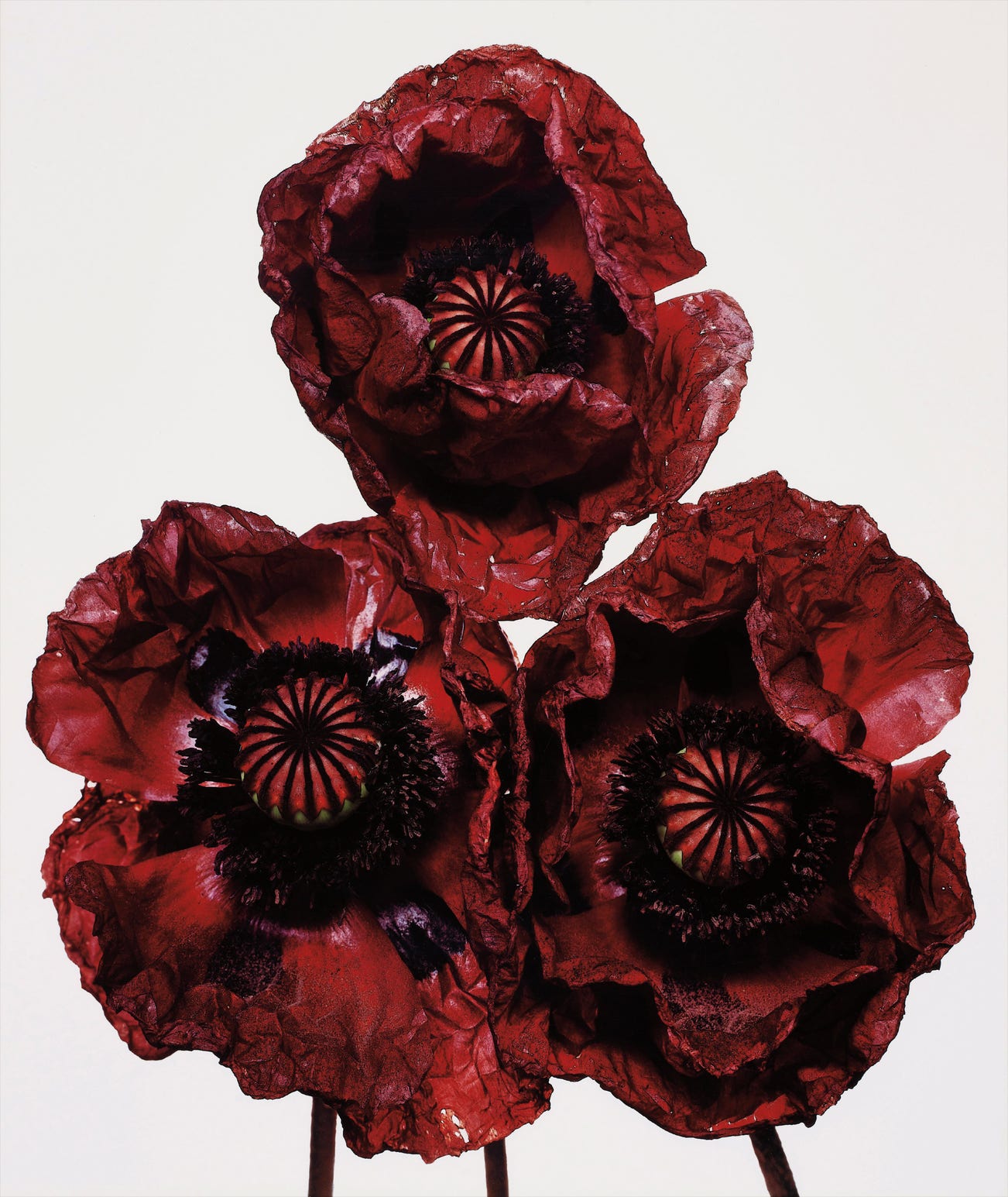 Irving Penn captures the exquisite Three Poppies with elegance and minimalism against his signature white backdrop. His seemingly uncomplicated composition places emphasis on the form, detail and structure of this opulent trio of ‘Arab Chief’ poppies, a variety that boasts massive nine-inch blooms of intense ruby red. Penn's flowers graced the pages of the holiday issues of American Vogue from 1967-73 with each year’s issue celebrating a specific flower. Poppies defined 1969.
