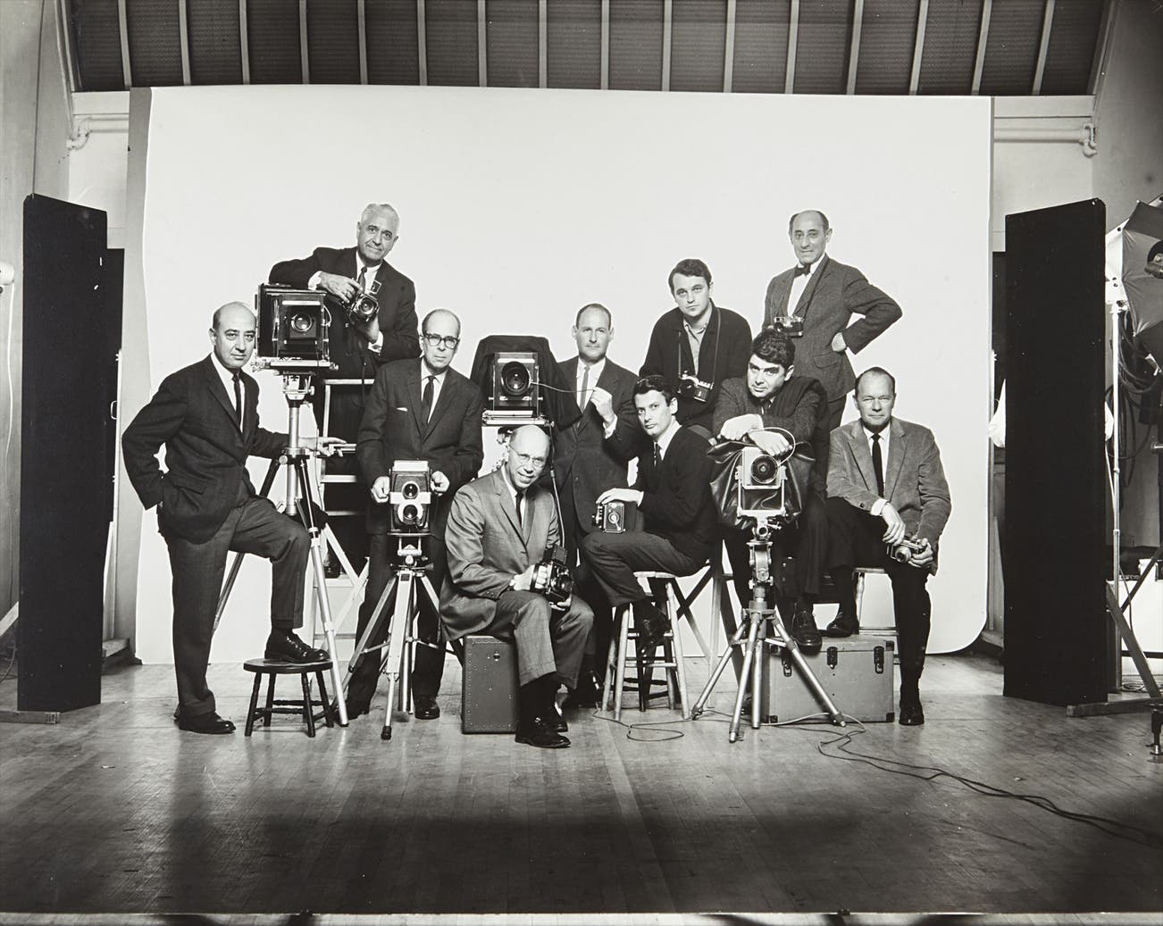 The camaraderie and cohesive nature of the exceptional group of trailblazers is best captured in Irving Penn’s Self-portrait with Famous Photographers, January, 1964 (the current lot). At the behest of the School’s advertising agency, the ten photographers assembled for a group shot intended for promotional purposes. Taken on January 25, 1964, the image had been months in the making, with the School’s Director, Victor Keppler, orchestrating the shoot in Bert Stern’s studio. It was decided that each photographer would take his turn shooting the group, reflected in an oversized custom mirror that had been brought in specifically for the occasion. Penn’s take with his 8x10 View Camera ended up being the final shot, selected for the photographer’s revered elegance in capturing the likeness and spirit of his peers. Indeed, Self-portrait with Famous Photographers marks a rare and a most exciting moment in the history of photography, when ten of the most talented and revered photographers in the world united for a wondrous spark.