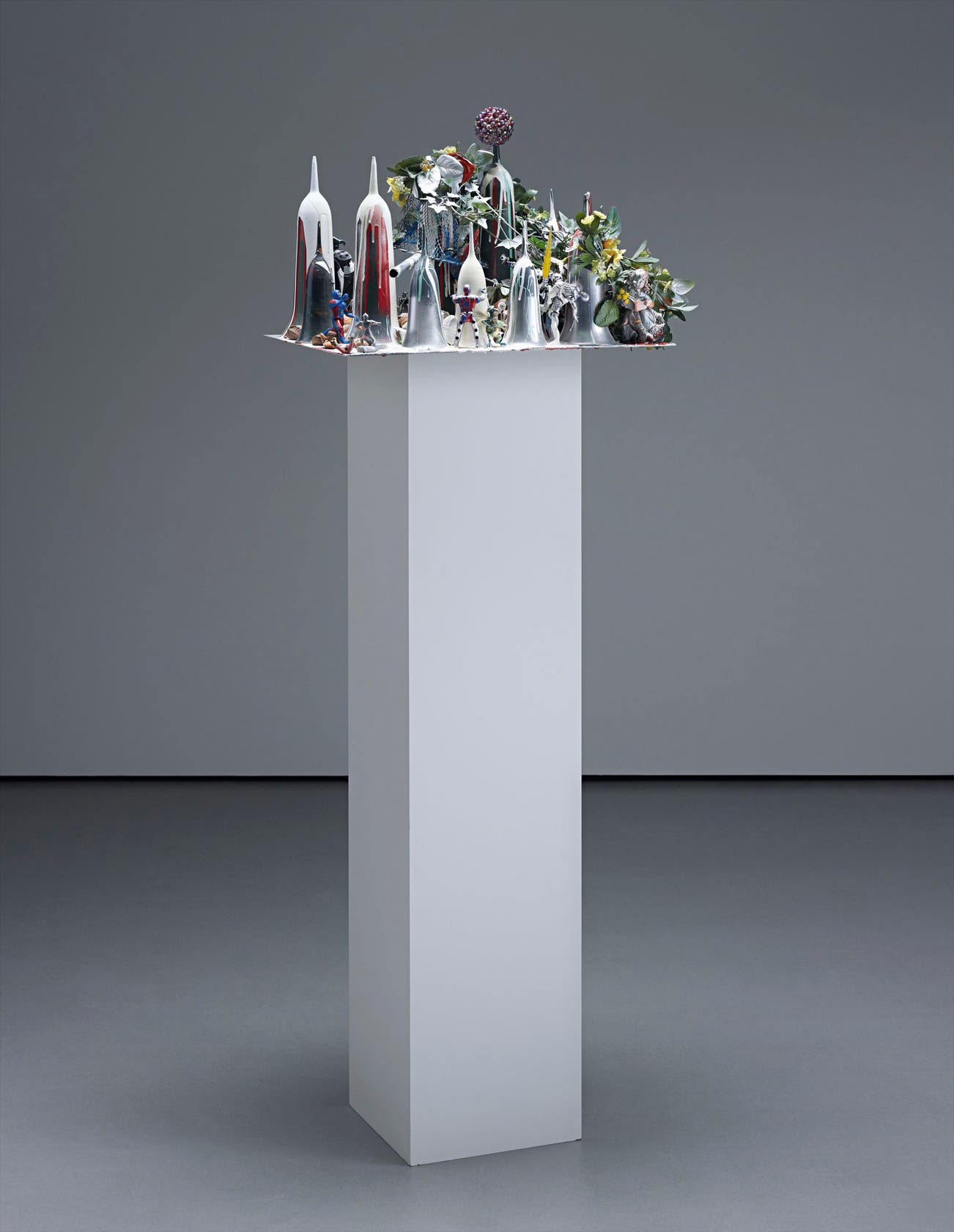 During her prolific and influential career as a sculptor, Isa Genzken has tirelessly mixed shoddy with shiny, high with low, dumb with clever, all with abundant excess and success. Her fragile but powerful constructions are primarily assembled from a riot of colourful non-artistic materials such as umbrellas, dolls, action figures, plastics, mirrors, and pop culture memorabilia. Her skill lies in channelling a coherent visual and conceptual narrative from such heterogeneous components, revealing a crystalline personal logic behind her iconoclastic strategies. Crucially, Genzken has the ability to continually re-invent her entire artistic process, her practice periodically re-emerging anew like a Phoenix from the ashes.