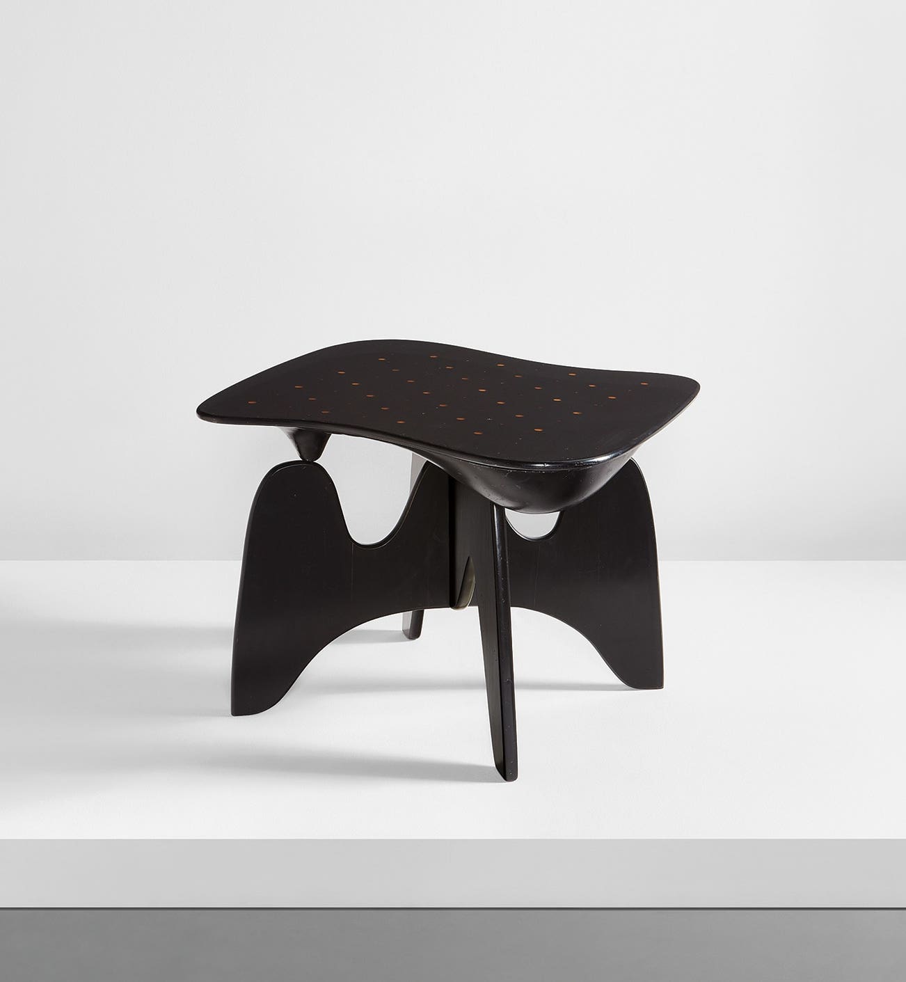 Noguchi’s design does away with the rigid formalism of the traditional chess board, softening its lines with his signature biomorphic organicism. Regular geometries are all but abandoned, and even the rectilinear grid is replaced by a field of inlaid dots of colored plastic. Constructed of veneered plywood—a wartime industrial material—Noguchi treated the table with a lacquer‐like ebonized finish to further emphasize its sculptural silhouette.