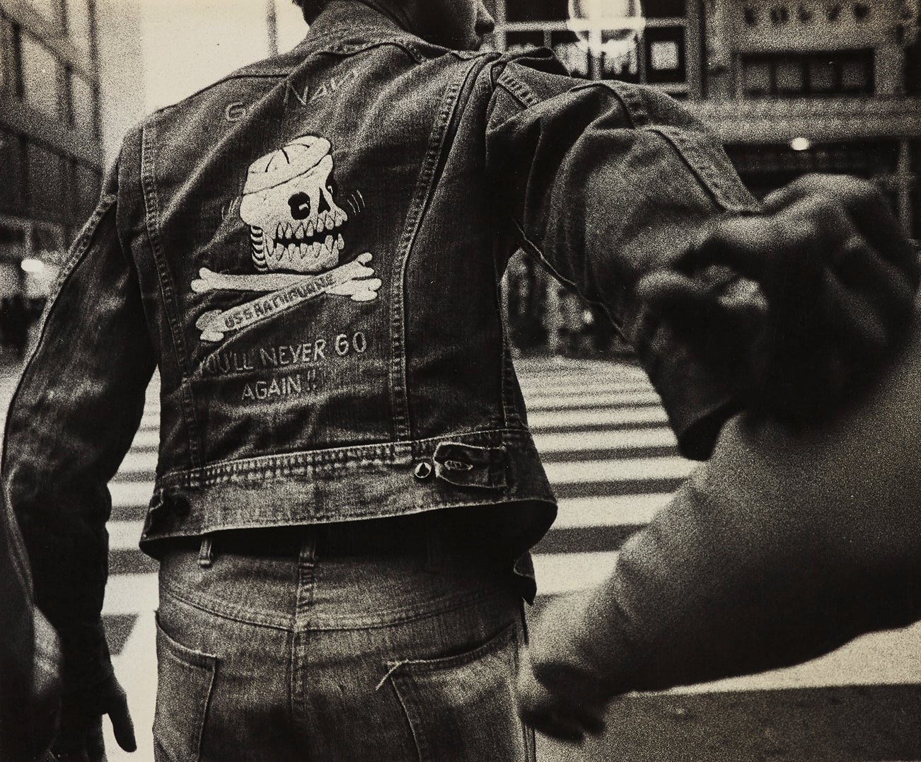 Here, we see a close up of the back of an American wearing a denim jacket embroidered with a skull and crossbones and the words ‘USS Rathburne’ and ‘You’ll Never Go Again!!’ as he is about to cross the road. The ambiguity of the scene is highlighted in Ishiuchi’s choice of angles and cropping. Her manipulation of the photographic image in the camera and in the darkroom enables her to tell a personal story that also alludes to broader themes of alienation and disaffection of urban life in post-war Japan.