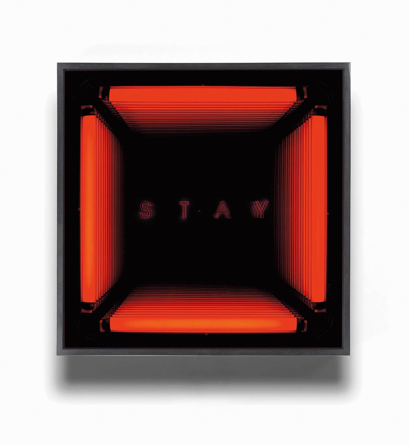 fluorescent light, color sleeves, mirror, one-way mirror, Plexiglas letters, wooden box and electrical energy