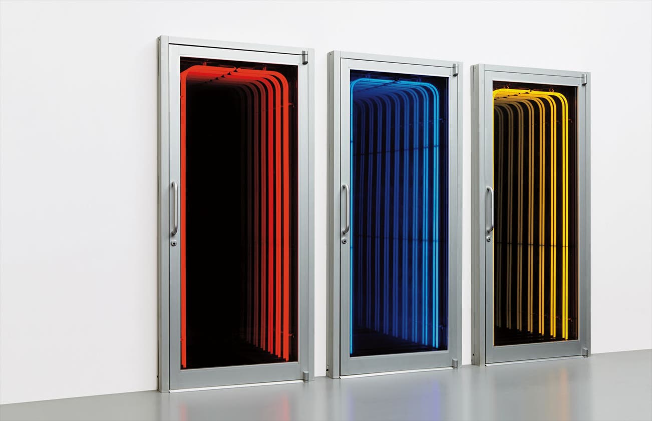 aluminum doors, mirrors, neon, triptych