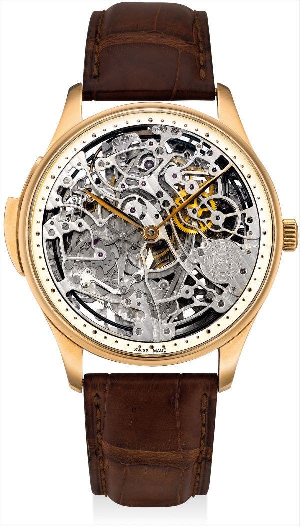 IWC presented the exquisite Portuguese Minute Repeater Squelette wristwatch at the SIHH in 2004. The watch features a finely crafted skeletonised dial that highlights the functional beauty of the minute repeating mechanism. The chapter ring at the outer edge is minimised, which helps the wearer to capture the quintessence of the gongs and hammers of the repeating mechanism. The present watch was produced in a limited edition of 50 pieces only.