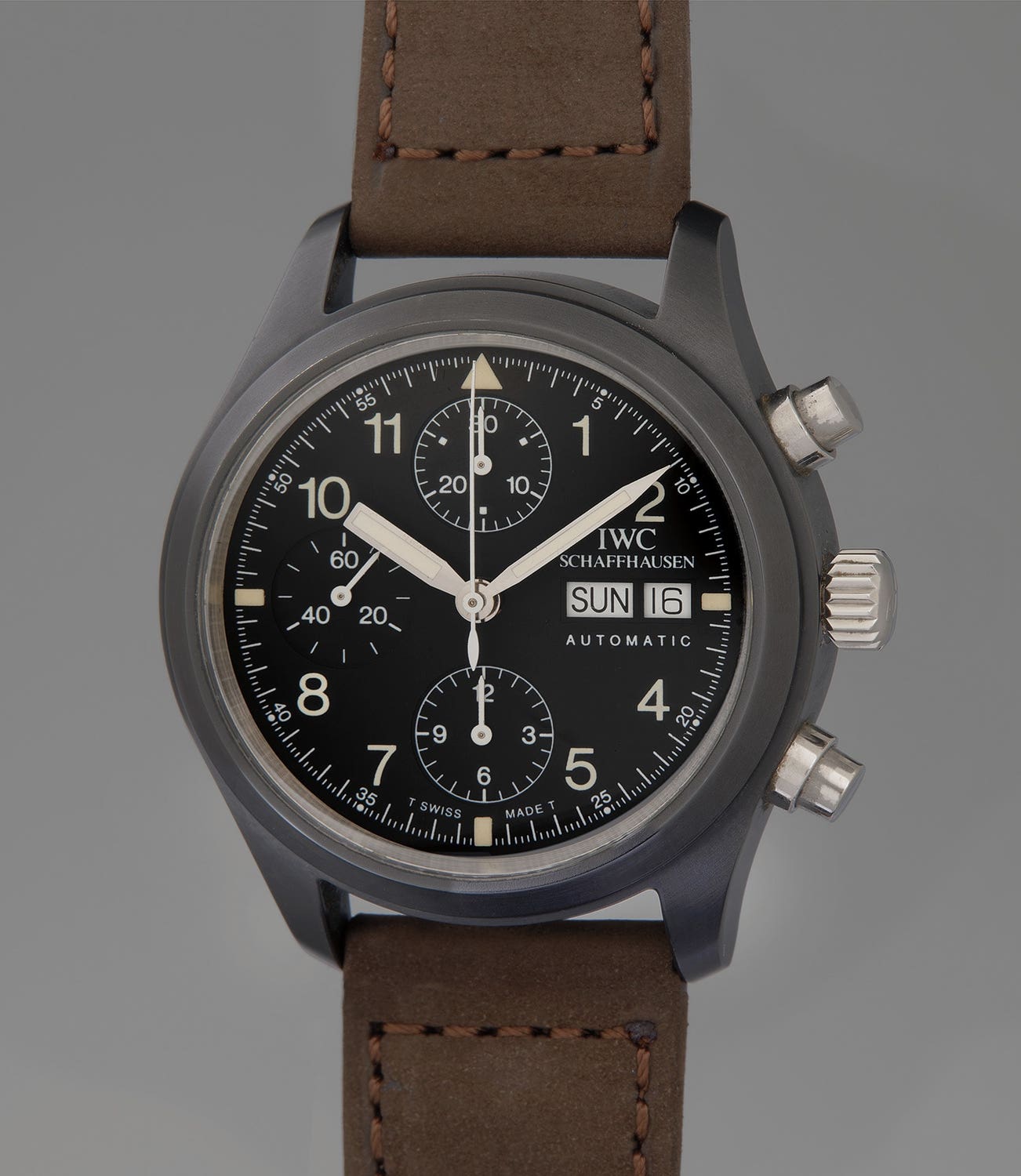 The reference 3705 has a masculine, sexy appeal and is today a very rare modern chronograph. The fully compressed and moulded ceramic case is sharp and has a bold look with its dark grey hue. It is a watch that harks back to the traditional past of horology but was made with cutting edge technology and materials of the era in which it was produced. The present example is offered in excellent condition and is enhanced by the accompanying international guarantee and presentation box. The watch remains in factory-original condition with few signs of wear since it was first manufactured in 1997. The Fliegerchronograph is noteworthy for its early and innovative use of ceramic, and its size and durability make it a perfect watch to be worn and enjoyed.